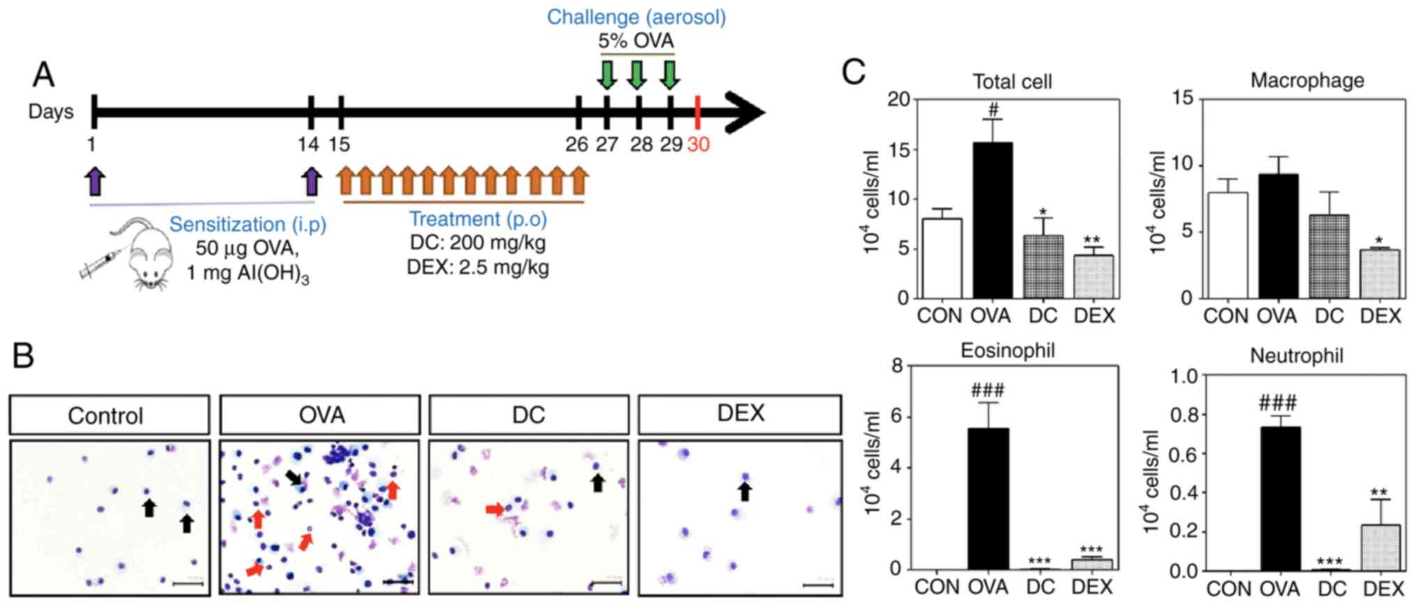 To examine the anti-inflammatory effect of DC on allergic asthma, we used the OVA-induced allergic asthma mouse model (Fig. 1A). The Cytospin cell preparations showed that the number of inflammatory cells, especially eosinophils, was markedly increased in the OVA-challenged mice compared with the control group. However, the DC and Dex treatment groups showed few cells-mostly macrophages (Fig. 1B). We measured the number of total and differential cells, including macrophages, neutrophils, and eosinophils, in BALF. The OVA-challenged group showed a significant increase in the number of total cells and inflammatory cells, including eosinophils and neutrophils, compared with the control group (Fig. 1C). However, treatment with DC markedly reduced the number of total cells and inflammatory cells compared with the OVA-challenged group.