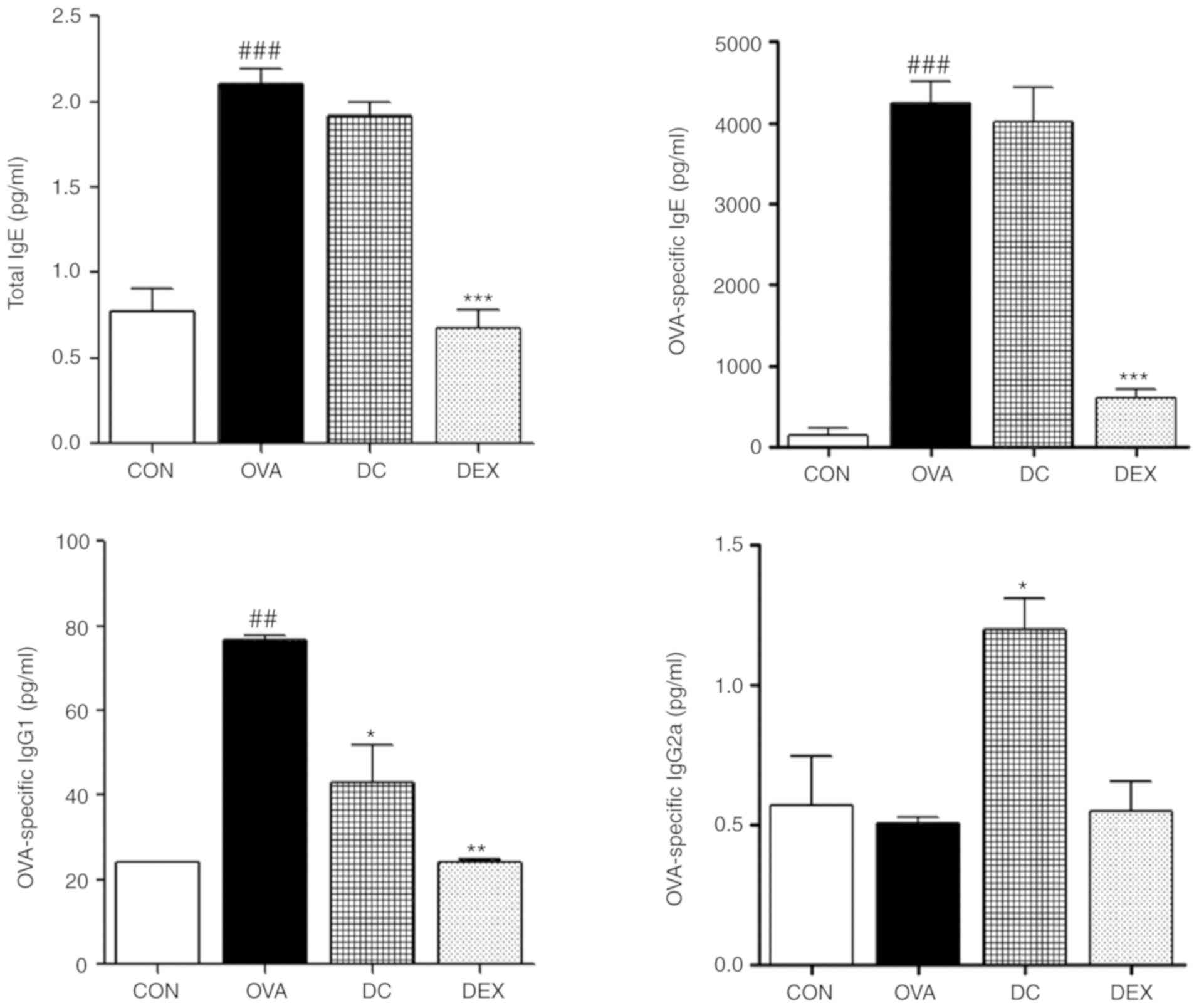 To investigate the therapeutic impact of DC on OVA-specific immune responses, we determined the serum immunoglobulin levels. As shown in Fig. 3, the levels of total and OVA-specific IgE and IgG1 were markedly increased in the OVA group compared with the control group. However, the DC treatment group demonstrated substantially decreased levels of total and OVA-specific IgE and IgG1 compared with the OVA group. Moreover, the level of OVA-specific IgG2a was upregulated by DC treatment. These results indicated that DC might facilitate anti-allergic activity by suppressing the production of allergic mediators.