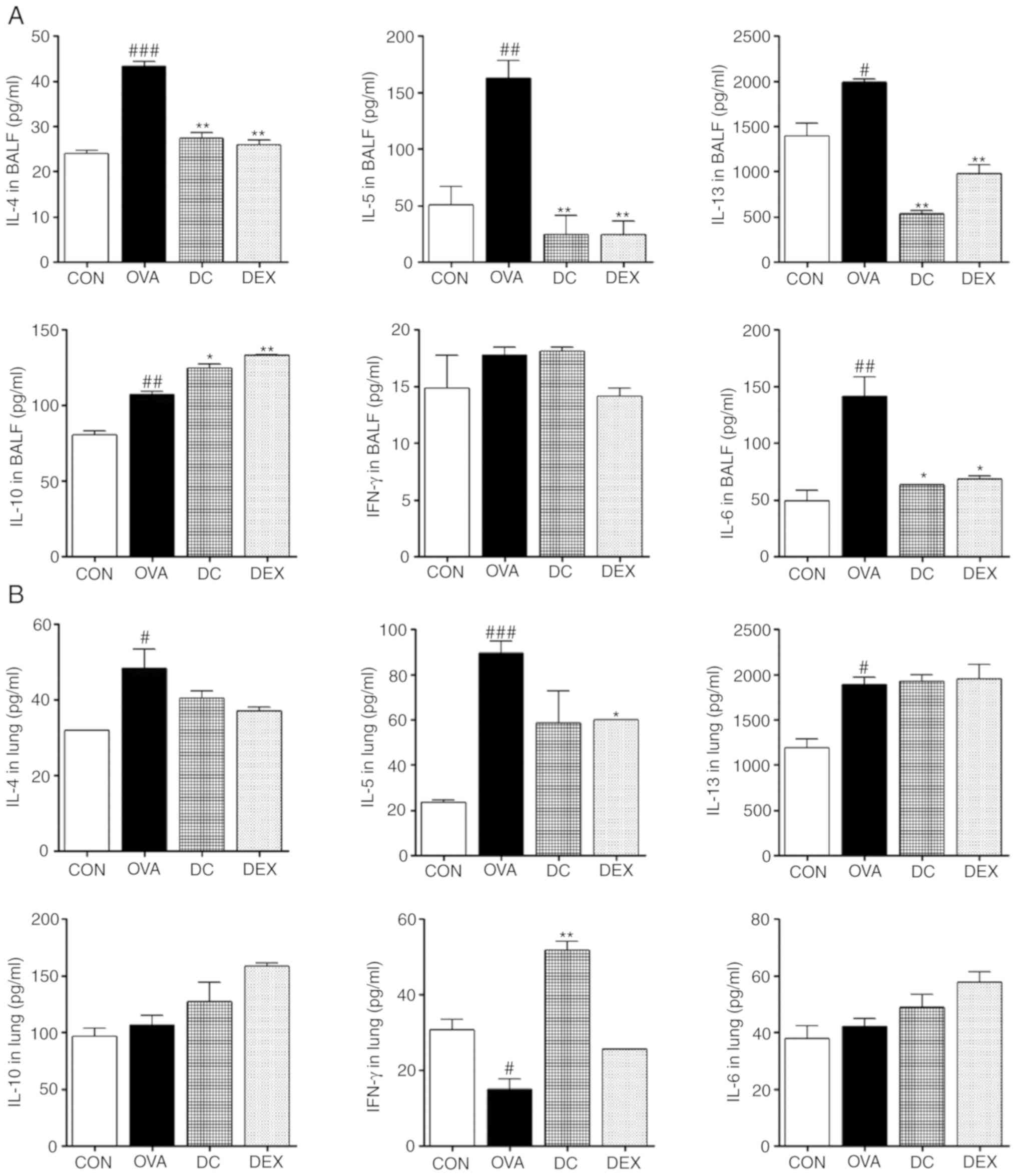 To elucidate the anti-allergic mechanism of DC on the Th1/Th2-mediated allergic response in the OVA-induced asthma mice models, the levels of secreted cytokines in BALF and lung homogenates were examined. First, we examined the secretion of the Th2 cytokines and proinflammatory cytokines, including IL-4, IL-5, IL-6, and IL-13, using ELISA. The OVA group showed increased levels of both in BALF and lung homogenates compared with the control group. However, DC treatment significantly decreased the levels of cytokines, including IL-4, IL-5, IL-6, and IL-13. In addition, the levels of anti-inflammatory cytokines (Th1 cytokines), such as IFN-γ and IL-10, were assayed. The DC-treated group showed a significant increase in the levels of IL-10 in BALF and IFN-γ in lung homogenates, and a decrease in IL-10 in lung homogenates and IFN-γ in BALF, as compared to the OVA group; however, no statistically significant differences were observed (Fig. 4). These results were consistent with the reduced infiltration of inflammatory cells in BALF and the lung tissue of DC-treated mice, via modulation of the level of Th1/Th2 cytokines. In this way, DC can reduce bronchial inflammation and immune reaction in patients with asthma.