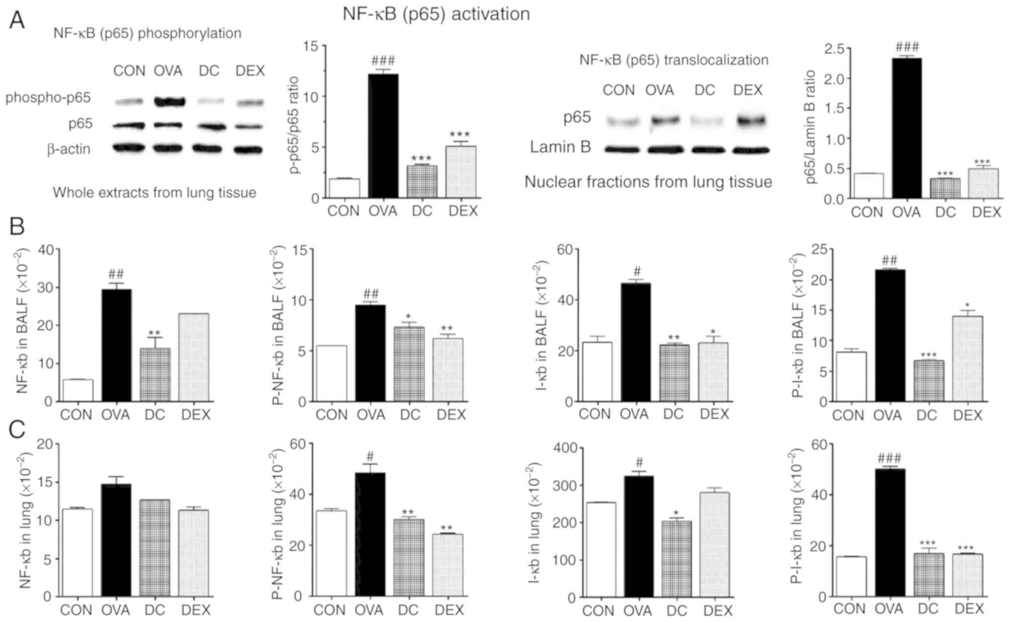 To understand the inhibitory effect of DC on allergic asthma, activation of NF-κB signaling-that regulates the expression Th2 cytokines-was measured in OVA-challenged mice. The levels of NF-κB p65 and p-NF-κB p65 activation in the lung tissue were assessed via western blot analysis. As presented in Fig. 5A, the activation of NF-κB p65 and p-NF-κB p65 was significantly upregulated in the OVA group compared with the control group. However, this increase was effectively blocked by DC treatment.
