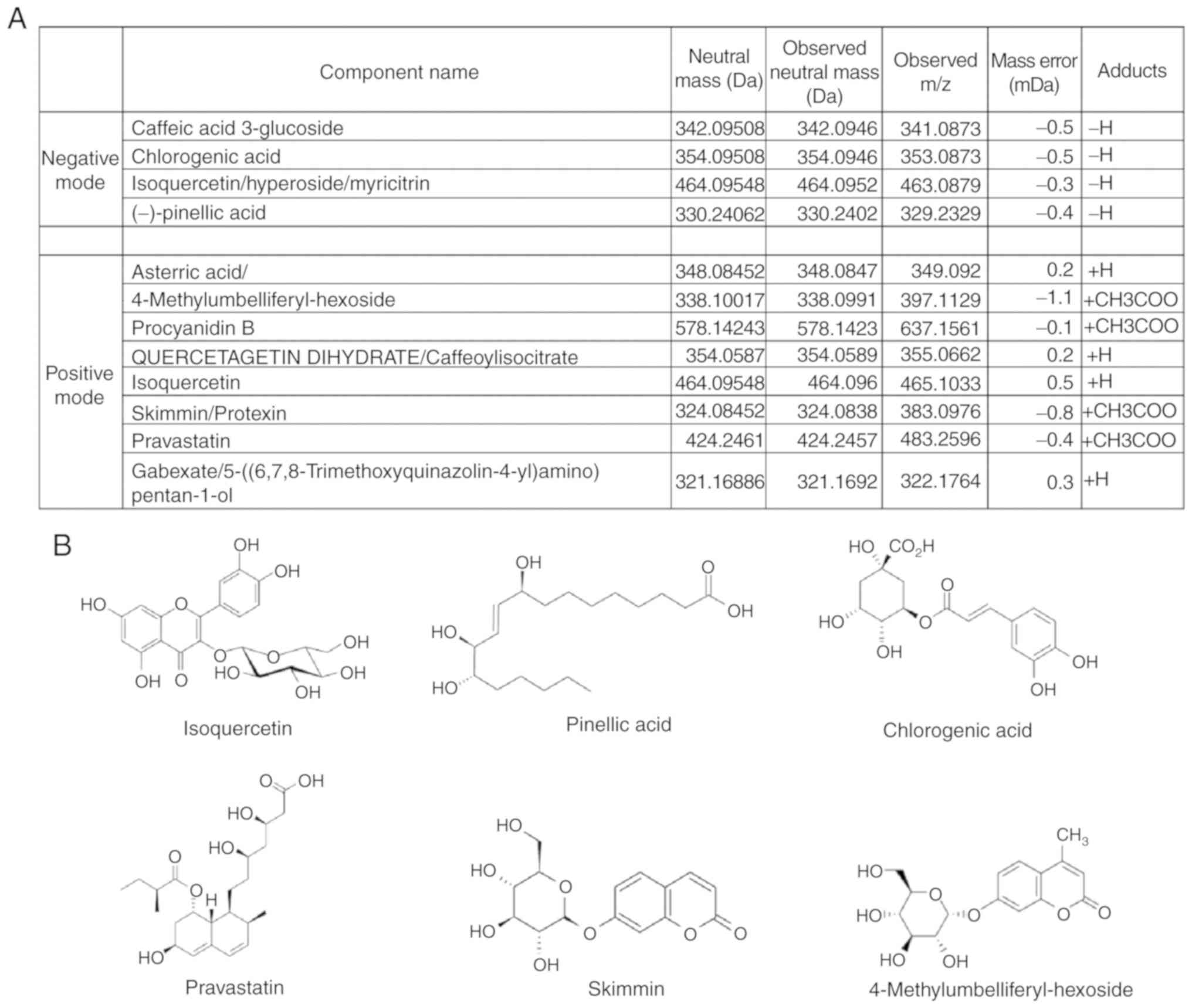 To investigate the main component present in the ethanolic extract of DC, UPLC/Q-TOF MS was used. The results showed four negative and eight positive modes (Fig. 7), which were identified as follows: Caffeic acid 3-glucoside, chlorogenic acid, isoquercetin, pinellic acid, procyanidin B, quercetagetin dehydrate, asterric acid, skimming/protexin, pravastatin, 4-methylumbelliferyl-hexoside, and gabexate/5-[(6,7,8-trimethoxyquinazolin-4-yl) amino)]pentan-1-ol.