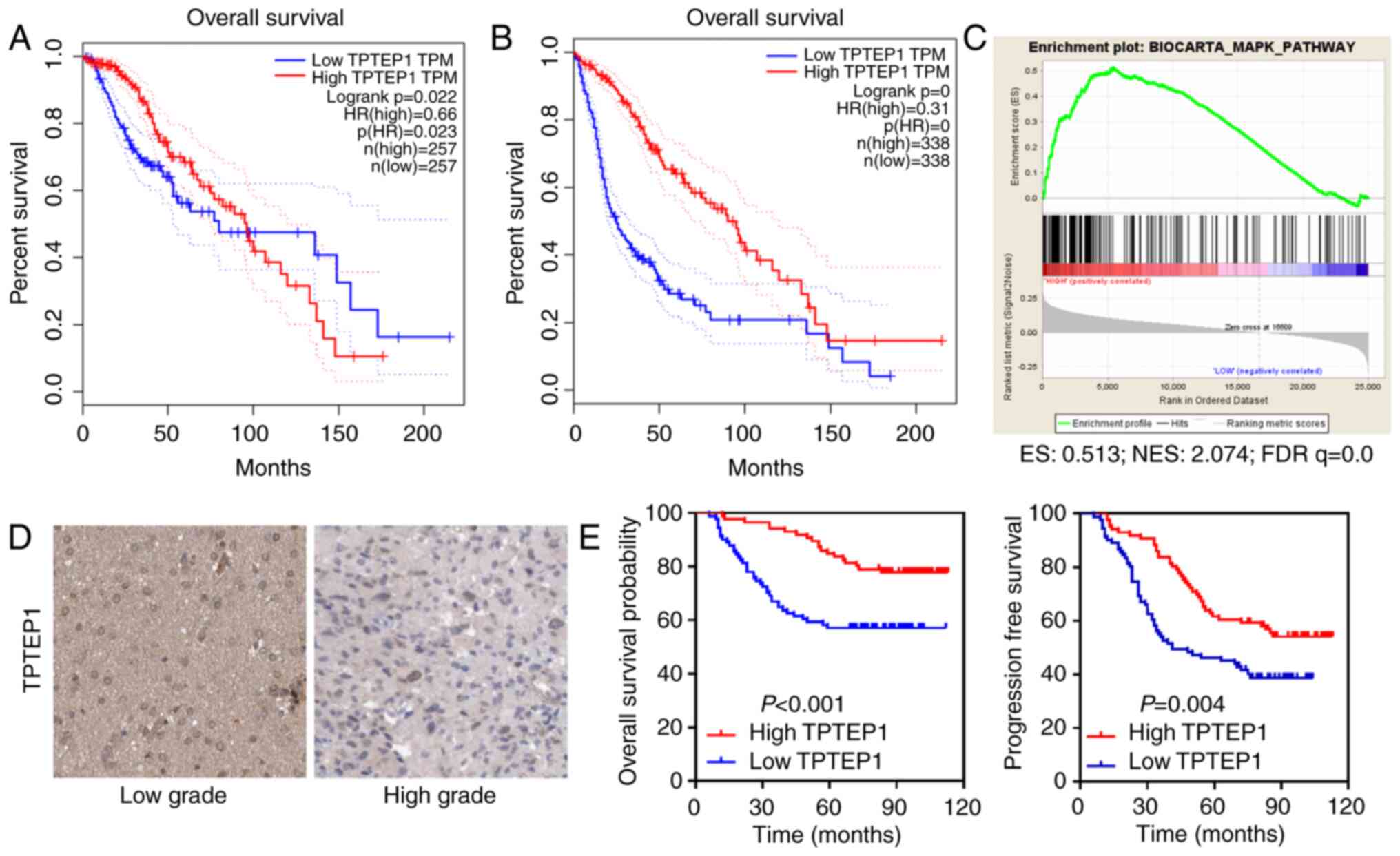 TCGA data analyses were performed to determine the function of lncRNAs in glioma. TPTEP1 was identified as a potential tumor suppressor that conferred good patient prognosis (Fig. 1A and B). Relying on data from TCGA datasets, GSEA suggested that TPTEP1 participated in the modulation of the MAPK signaling pathway (Fig. 1C).