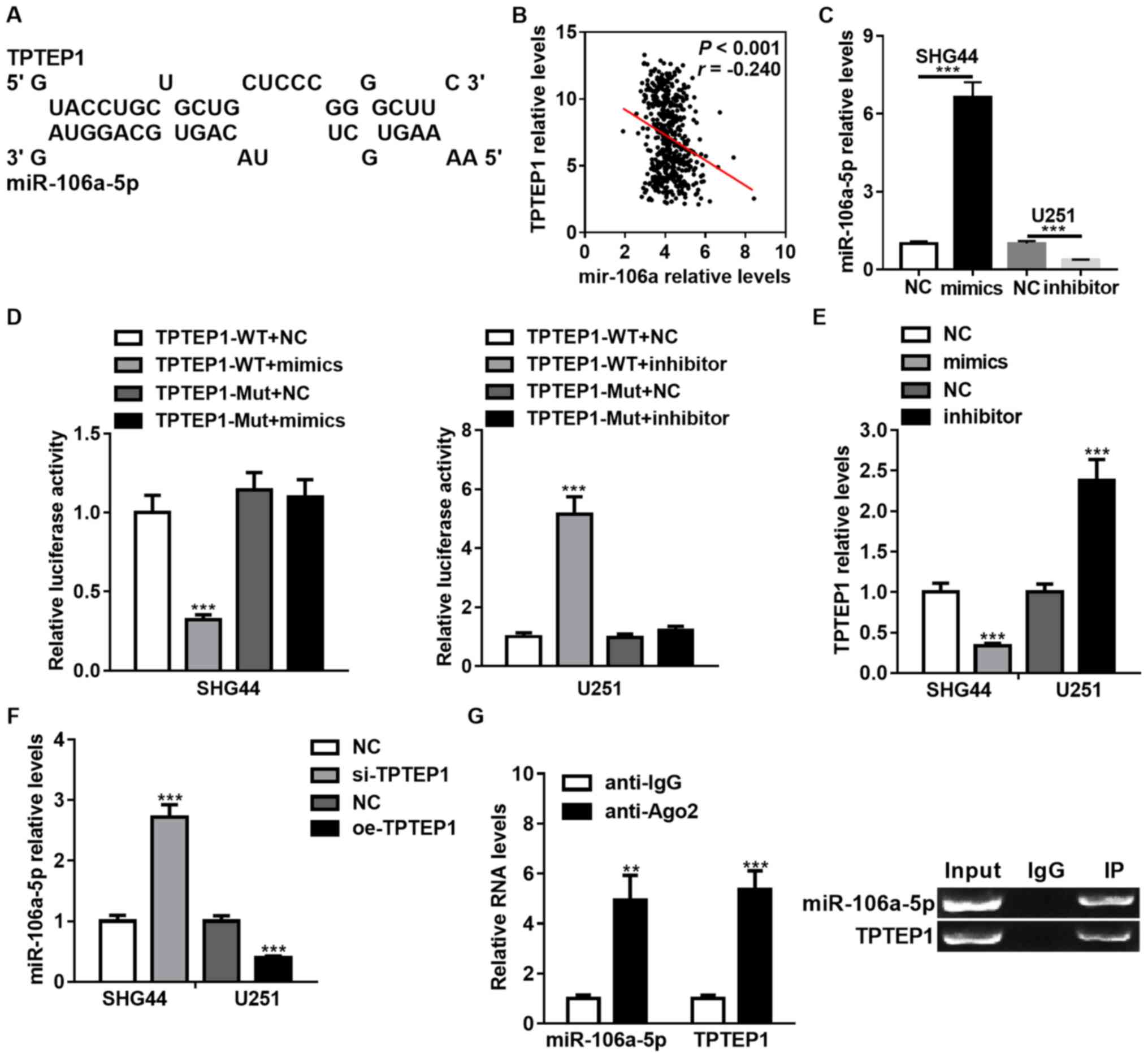 Total RNA was extracted from glioma cells using TRIzol® reagent (Invitrogen; Thermo Fisher Scientific, Inc.) and was reverse-transcribed into cDNA using the reverse transcriptase kit (cat. no. D350A, Takara Bio, Inc.), according to the manufacturer's protocols. qPCR was subsequently performed using the SYBR Premix Ex Taq™ II kit (cat. no. DRR081, Takara Bio, Inc.), on an ABI ViiA 7 sequence detection system (Applied Biosystems; Thermo Fisher Scientific, Inc.), according to the manufacturer's protocols. The following primer sequences were used for qPCR: Hsa-miR-106a-5p primer, 5′-AAAAGTGCTTACAGTGCAGGTAG-3′; TPTEP1 forward, 5′-CTGGGAGAAGTGCCCTTGC-3′ and reverse, 5′-CACCTCATCAGTCATTTGCTCA-3′; U6 forward, 5′-CTCGCTTCGGCAGCACA-3′ and reverse, 5′-AACGCTTCACGAATTTGCGT-3′; and GAPDH forward, 5′-GCAAATTCCATGGCACCGT-3′ and reverse, 5′-TCGCCCCACTTGATTTTGG-3′. The following thermocycling conditions were used for qPCR: Initial denaturation at 95°C for 10 sec, followed by 40 cycles of denaturation at 94°C for 5 sec and annealing/extension at 60°C for 30 sec. Relative gene expression levels were calculated using the 2−ΔΔCq method (22) and normalized to the internal reference genes U6 or GAPDH.