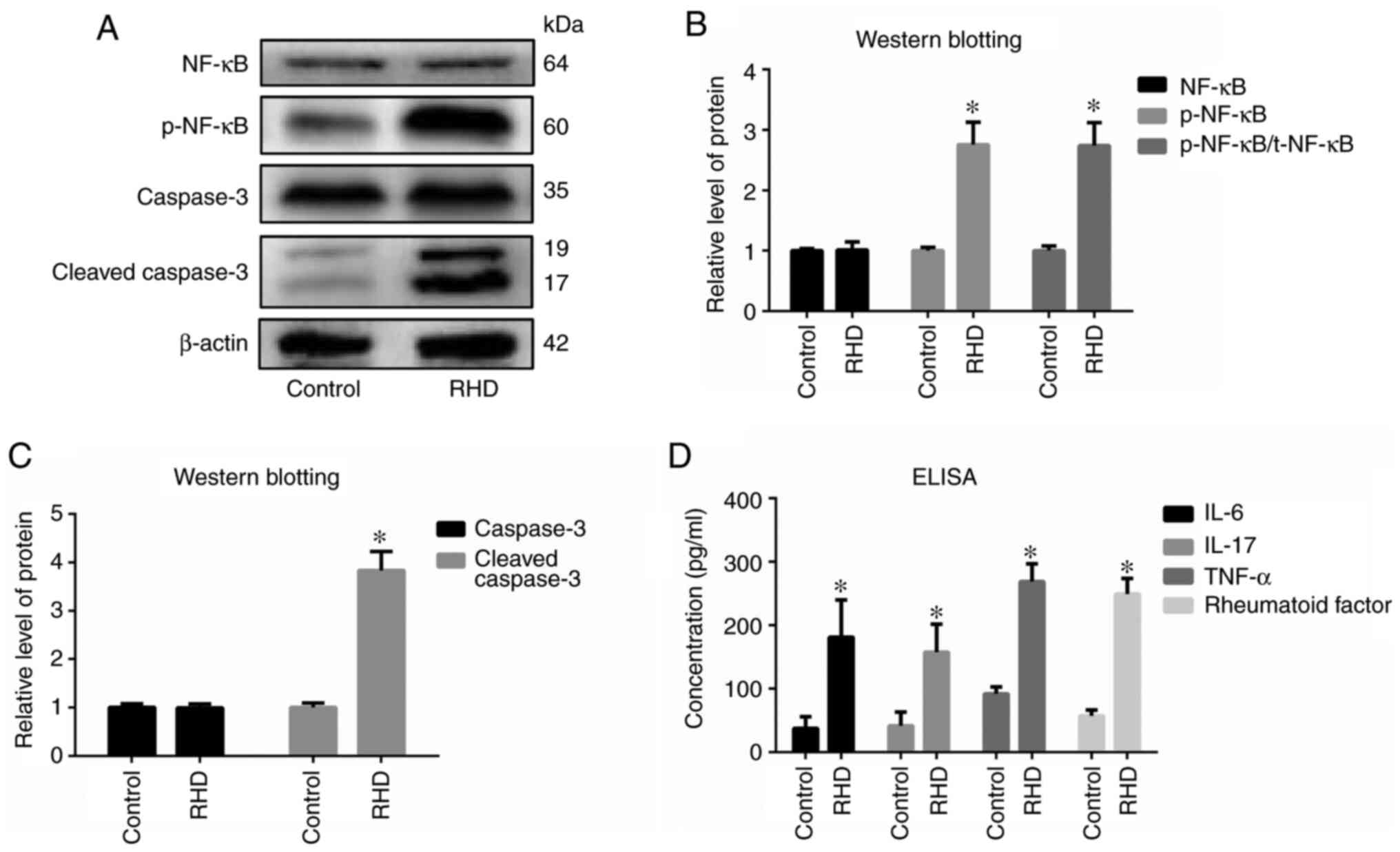 Levels of IL-6, IL-17, TNF-α and RF in the RHD group were significantly increased compared with those observed in the control group (P<0.05; Fig. 5D).