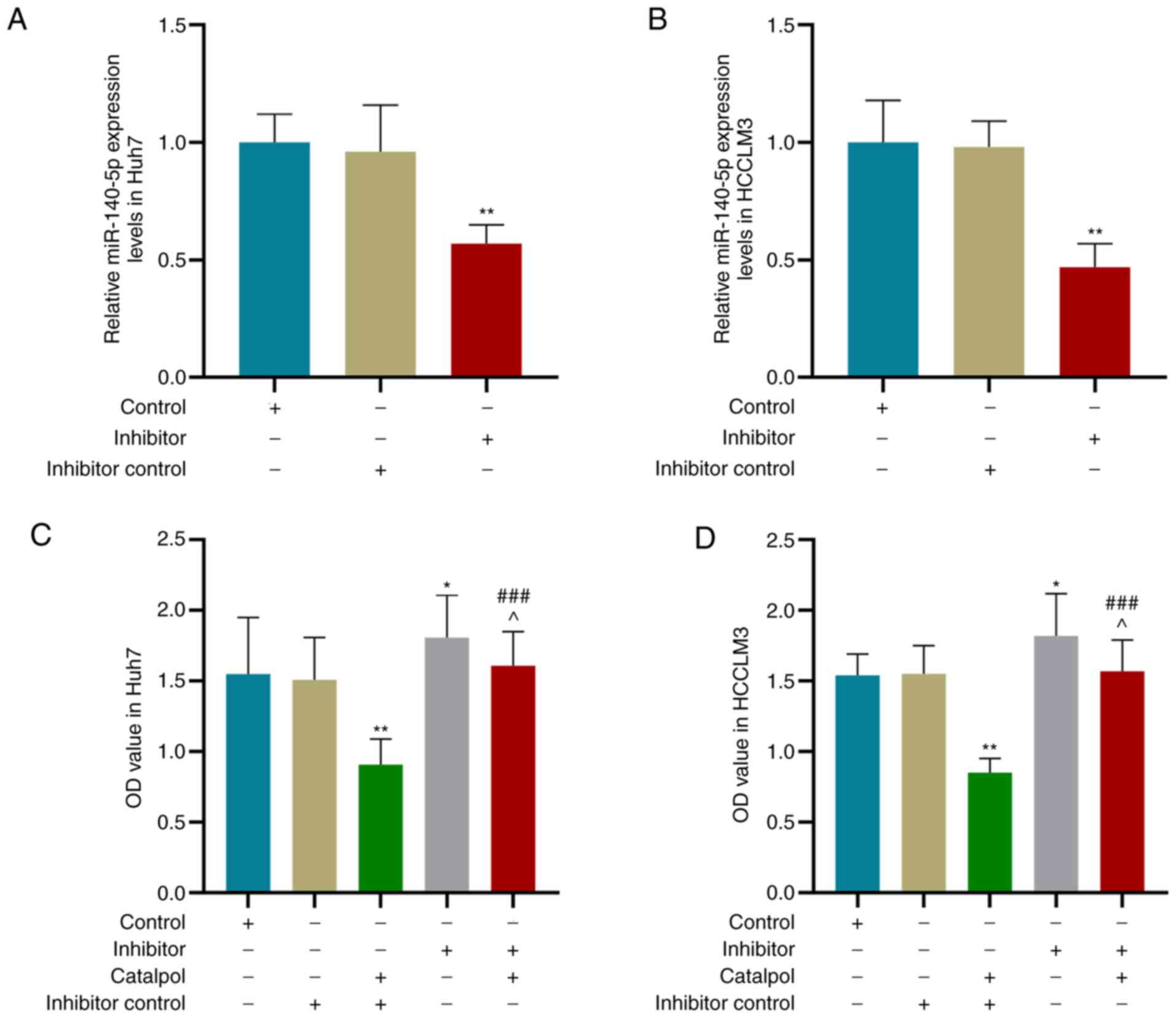 It was demonstrated that 50 µM catalpol increased miR-140-5p expression in Huh7 and HCCLM3 cells. Therefore, a miR-140-5p inhibitor was transfected into HHC cells to investigate whether catalpol inhibits HCC cell proliferation and metastasis via regulating miR-140-5p expression. Huh7 and HCCLM3 cells were transfected with miR-140-5p inhibitor and treated with 50 µM catalpol for 48 h. RT-qPCR results indicated that, compared with the Inhibitor control group, miR-140-5p expression levels in Huh7 (Fig. 5A) and HCCLM3 (Fig. 5B) cells were decreased by miR-140-5p inhibitor (P<0.01).