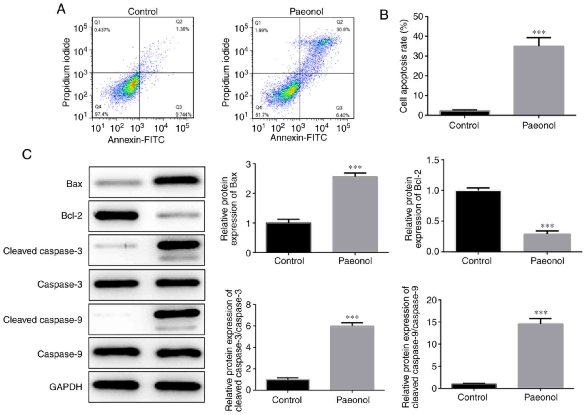 Flow cytometry was utilized to detect the induction of apoptosis in HeLa cells. The results indicated that the percentage of apoptotic cells in the Pae group was significantly increased compared with that of the control cells (Fig. 2A and B). Western blot analysis indicated that the expression levels of Bcl-2 were markedly decreased, while those of the pro-apoptotic proteins Bax, cleaved caspase-3 and cleaved caspase-9 were significantly increased (Fig. 2C). Therefore, these results indicated that Pae promoted the induction of apoptosis in HeLa cells.