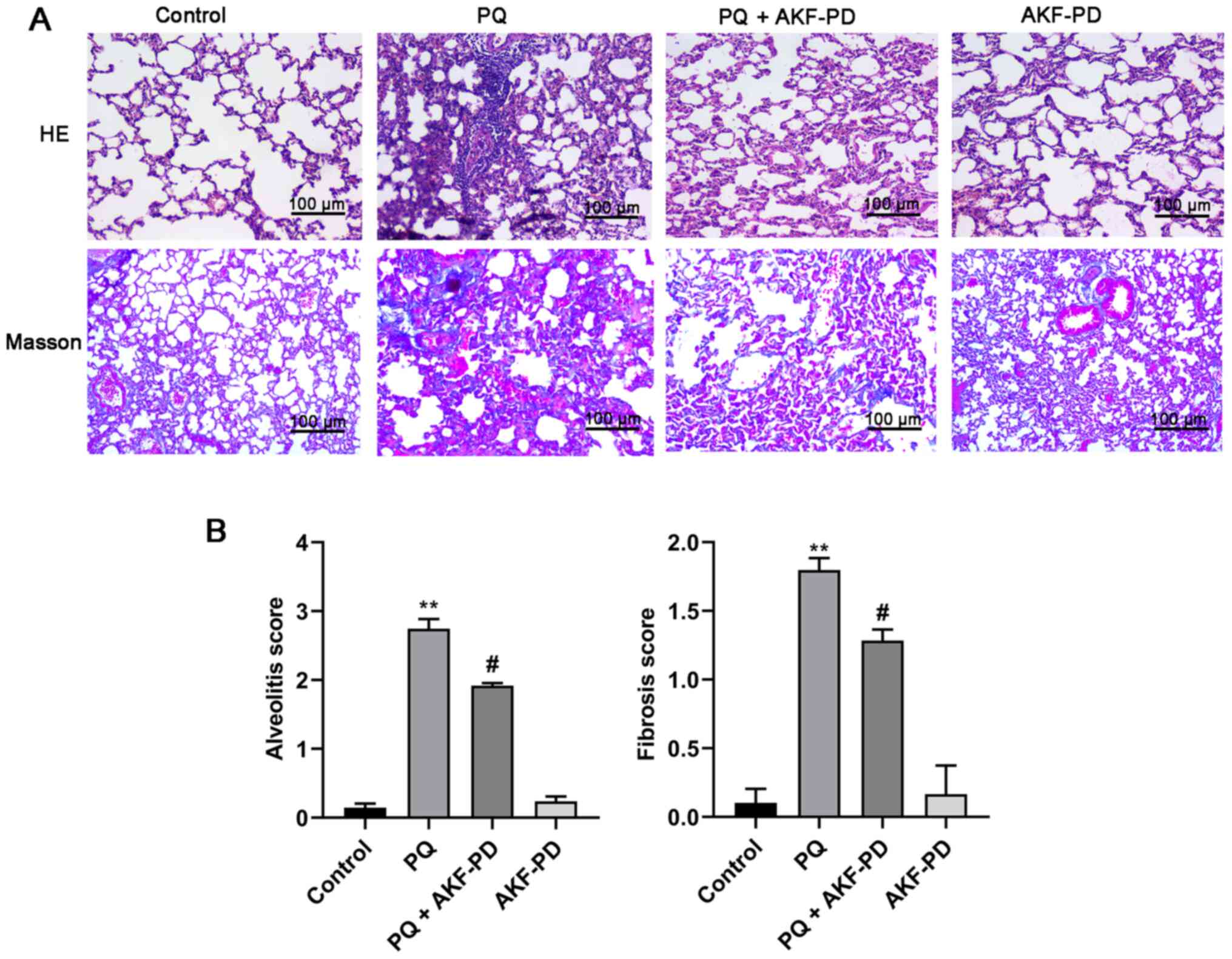 In conclusion, the current study indicated that AKF-PD inhibited the activation of the PI3K/Akt/mTOR signaling pathway, enhanced autophagy and suppressed the occurrence of EMT, thereby alleviating the pulmonary fibrosis caused by PQ poisoning. The present study explored the effect and mechanism of AKF-PD on pulmonary fibrosis caused by PQ poisoning and laid the groundwork for investigation into future therapeutic strategies that can be used to treat pulmonary fibrosis.