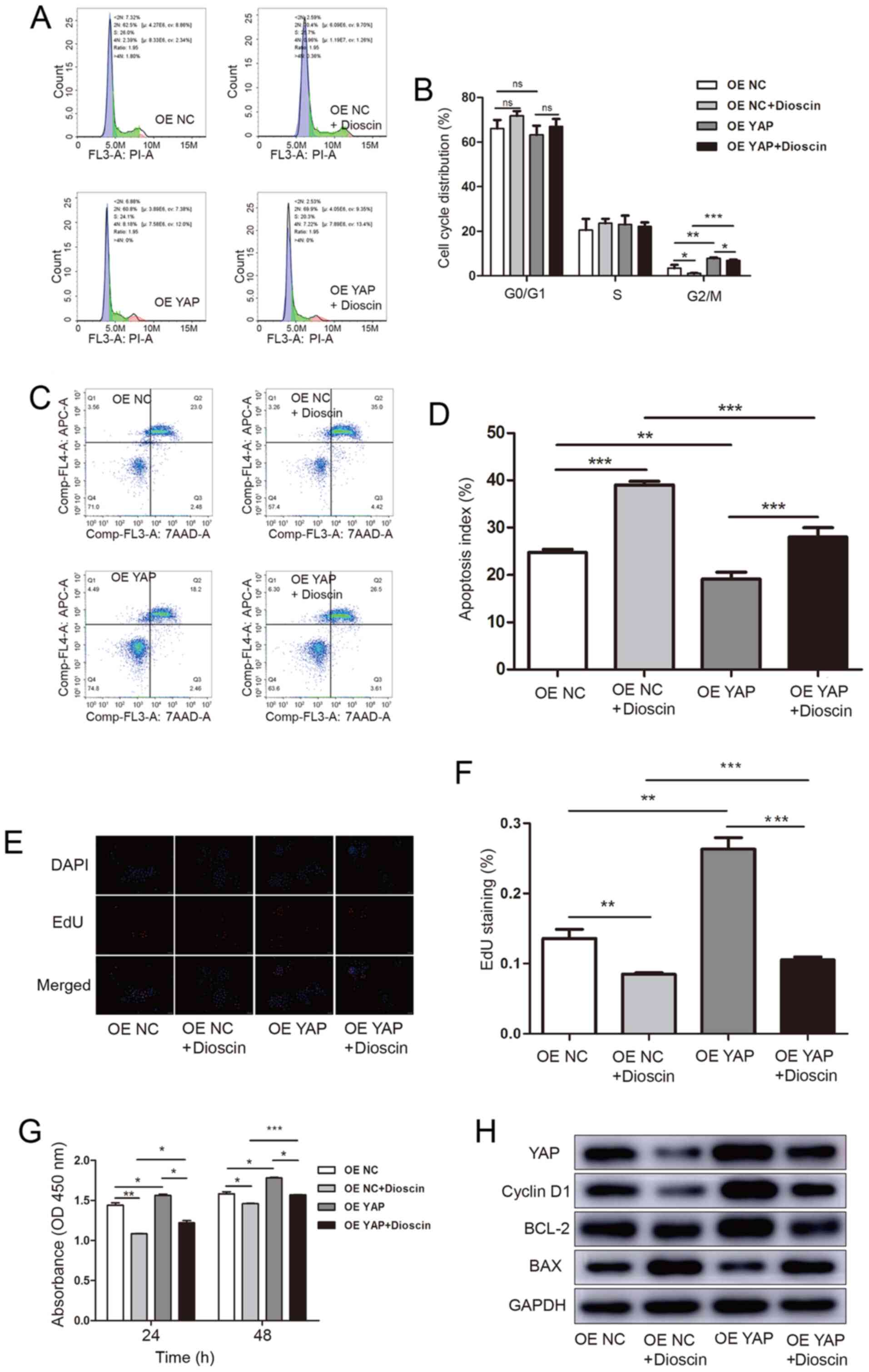 Subsequently, the expression levels of YAP, cyclin D1, BCL-2 and BAX were measured. Similarly, the combination of dioscin treatment and YAP knockdown led to more notable suppressive effects on protein expression compared with either intervention alone. However, the expression levels of the proapoptotic protein BAX displayed the opposite trends (Fig. 5H).