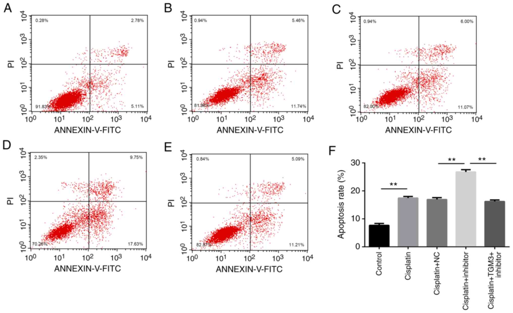 The transfected cells were seeded into a 96-well plate at a density of 1×105 cells/well. Medium containing 4 µmol/l cisplatin was added for 48 h at 37°C, in the presence of 5% CO2. Following trypsinization and washing with PBS (Thermo Fisher Scientific, Inc.), the cells were double stained with FITC Annexin V and propidium iodide (PI) for 10 min in the dark at room temperature. Finally, the apoptotic rate at the early and late period was determined via a FACScan flow cytometer and analyzed with CellQuest software version 5.2.1 (both from BD Biosciences).