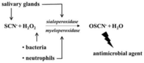 Pruitt KM, Mansson-Rahemtulla B and Tenovuo J: Detection of the hypothiocyanite (OSCN-) ion in human parotid saliva and the effect of pH on OSCN- generation in the salivary peroxidase antimicrobial system. Arch Oral Biol. 28:517–525. 1983. View Article : Google Scholar : PubMed/NCBI | |