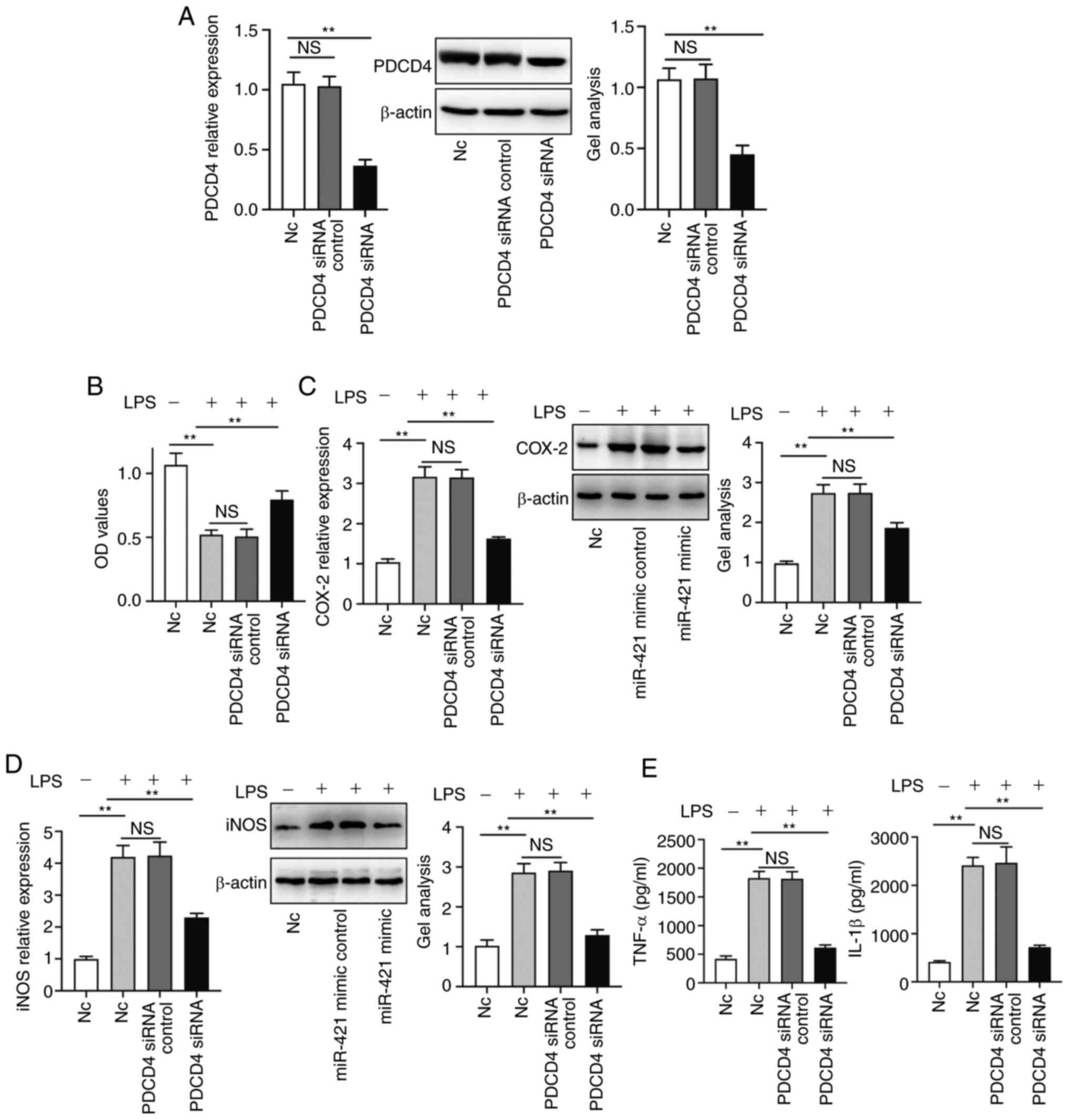 Using StarBase 3.0, it was predicted that miR-421 binds to a specific site in the 3′-UTR of PDCD4 mRNA (Fig. 3A). Dual-luciferase reporter assay confirmed that miR-421 directly targeted the 3′-UTR of PDCD4 mRNA to inhibit its expression (Fig. 3B). Further studies on the function of the PDCD4 gene demonstrated that PDCD4 siRNA blocked the inhibitory effect of LPS on RAW 264.7 cell viability (Fig. 4A and B). PDCD4 siRNA also inhibited LPS-induced expression of COX-2 and iNOS in RAW 264.7 cells (Fig. 4C and D). In addition, PDCD4 siRNA inhibited the LPS-induced increase of IL-1β and TNF-α production by RAW 264.7 cells (Fig. 4E).