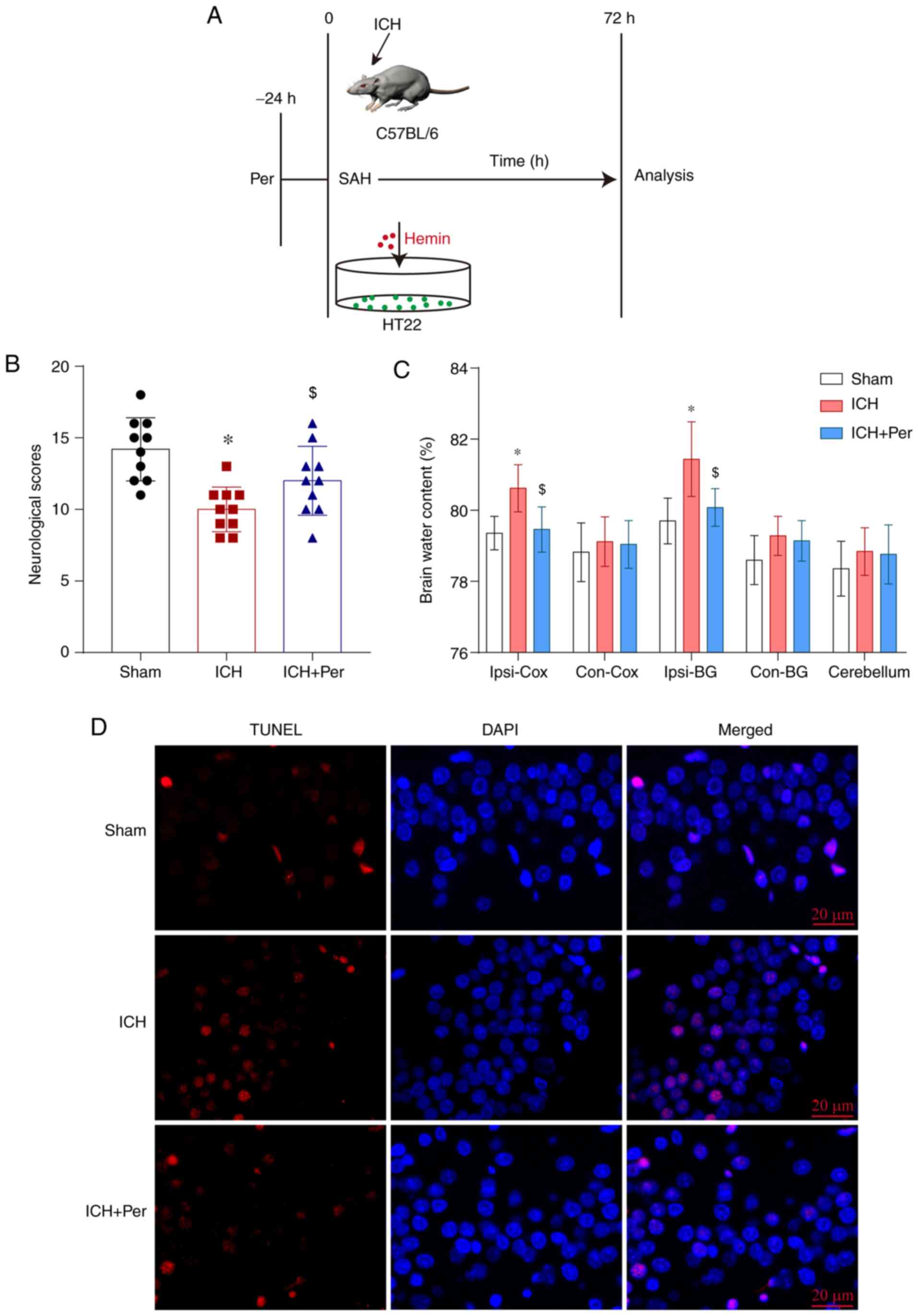 Perampanel was purchased from Santa Cruz Biotechnology, Inc. (cat. no. sc-477647). The mice were orally administered with saline water or perampanel (5 mg/kg) for 24 h before ICH (Fig. 1A). HT22 cells (Procell Life Science & Technology Co., Ltd.) were cultured in Dulbecco's modified Eagle's medium containing 10% fetal bovine serum and 1% penicillin/streptomycin and until 70% confluent at 37°C with 5% CO2, then were treated with perampanel (2 mmol/l) for 24 h prior to hemin insult (Fig. 1A). z-VAD-fmk (cat. no. 187389-52-2), 3-Methyladenine (3-MA; cat. no. 5142-23-4), and Necrostatin-1 (cat. no. 4311-88-0) were purchased from Selleck Chemicals.