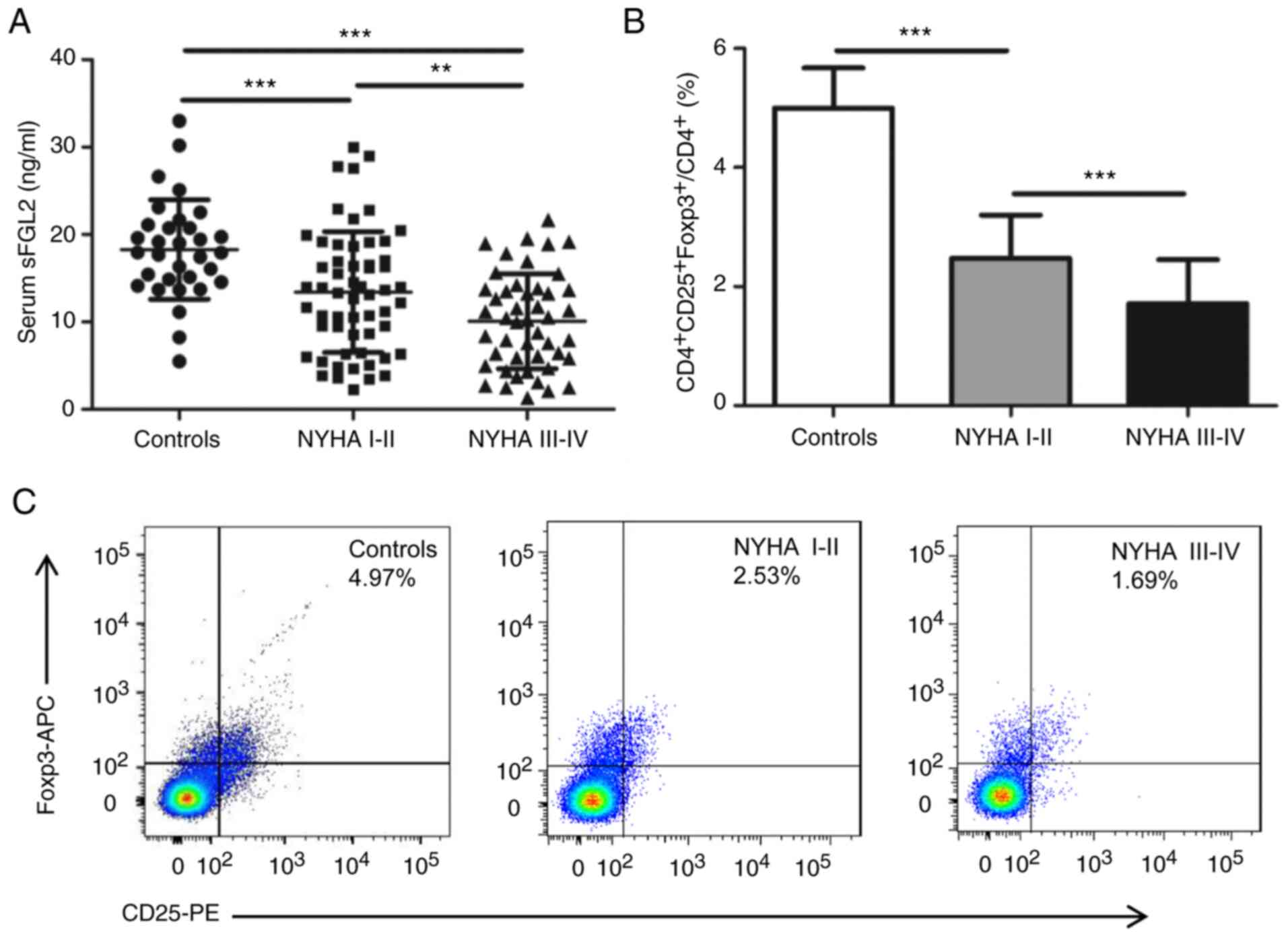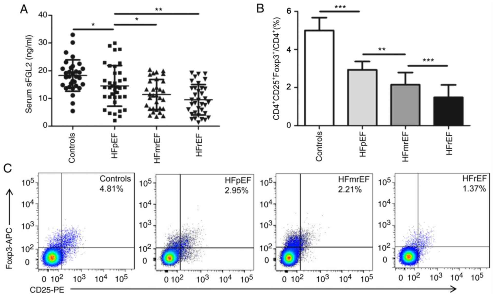 The present study proved for the first time, to the best of the authors' knowledge, that serum sFGL2 levels were markedly decreased in patients with IHF, synchronically accompanied by a pronounced reduction of circulating CD4+CD25+Foxp3+ Tregs frequencies and compromised Tregs suppressive function. In patients with IHF, sFGL2 levels and Tregs frequencies were decreased with the deterioration of cardiac function. In addition, a positive correlation was observed between serum sFGL2 levels and LVEF and a significant inverse correlation between serum sFGL2 levels and LVEDD and NT-proBNP. Moreover, sFGL2 levels were significantly and positively correlated with the frequencies of CD4+CD25+Foxp3+ Tregs.