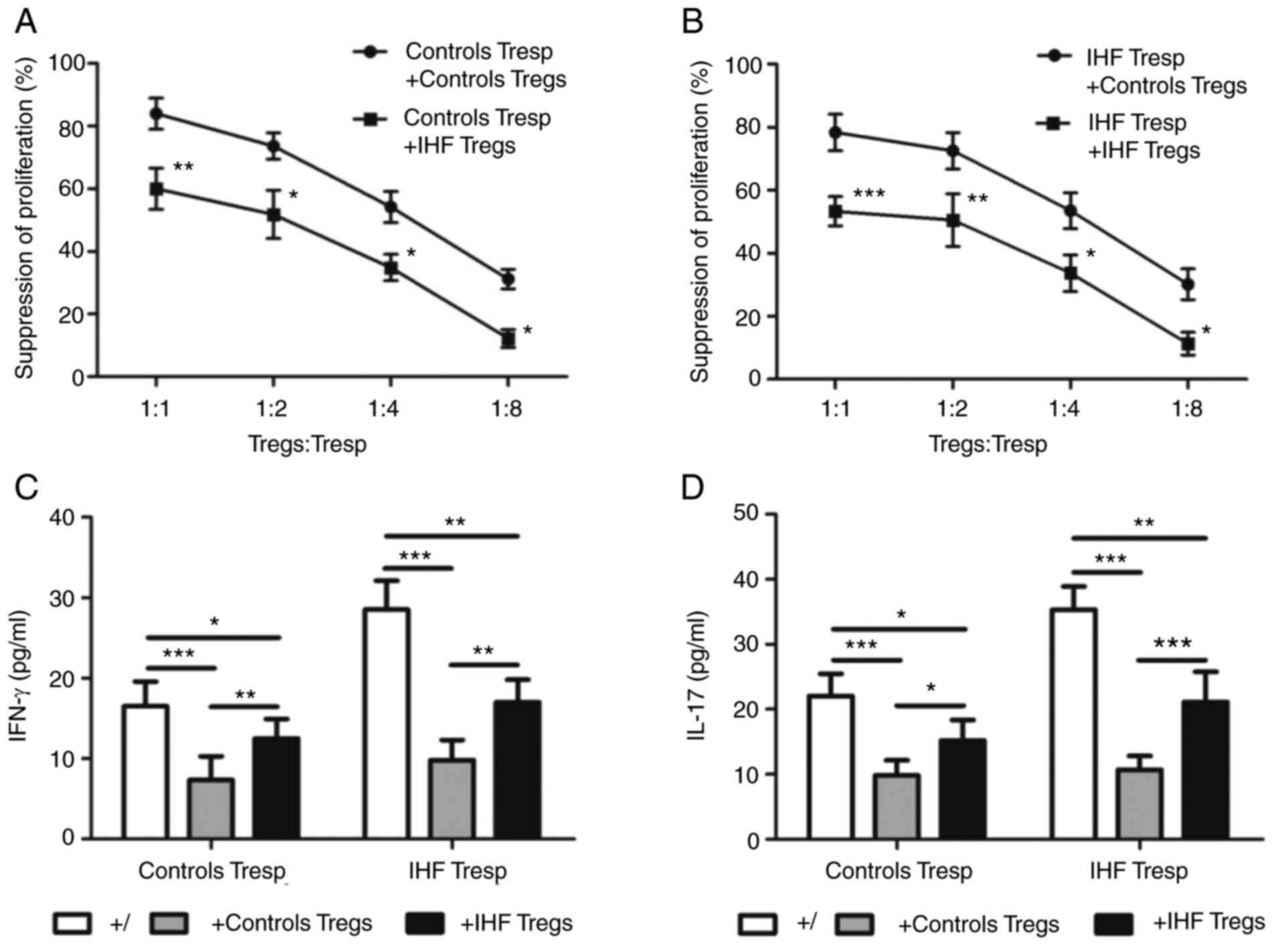 Over-expressed pro-inflammatory cytokines such as IFN-γ and IL-17 participate in immune imbalance in the progress of IHF (9). Thus, the IFN-γ and IL-17 levels in the supernatants of the co-culture system were next assessed to investigate whether Tregs were effective to suppress IFN-γ and IL-17 production by Tresp cells. Regardless of co-cultured with Tresp cells from controls or patients with IHF, Tregs from patients with IHF were significantly worse at suppressing IFN-γ and IL-17 secretion compared with controls (Fig. 4C and D).