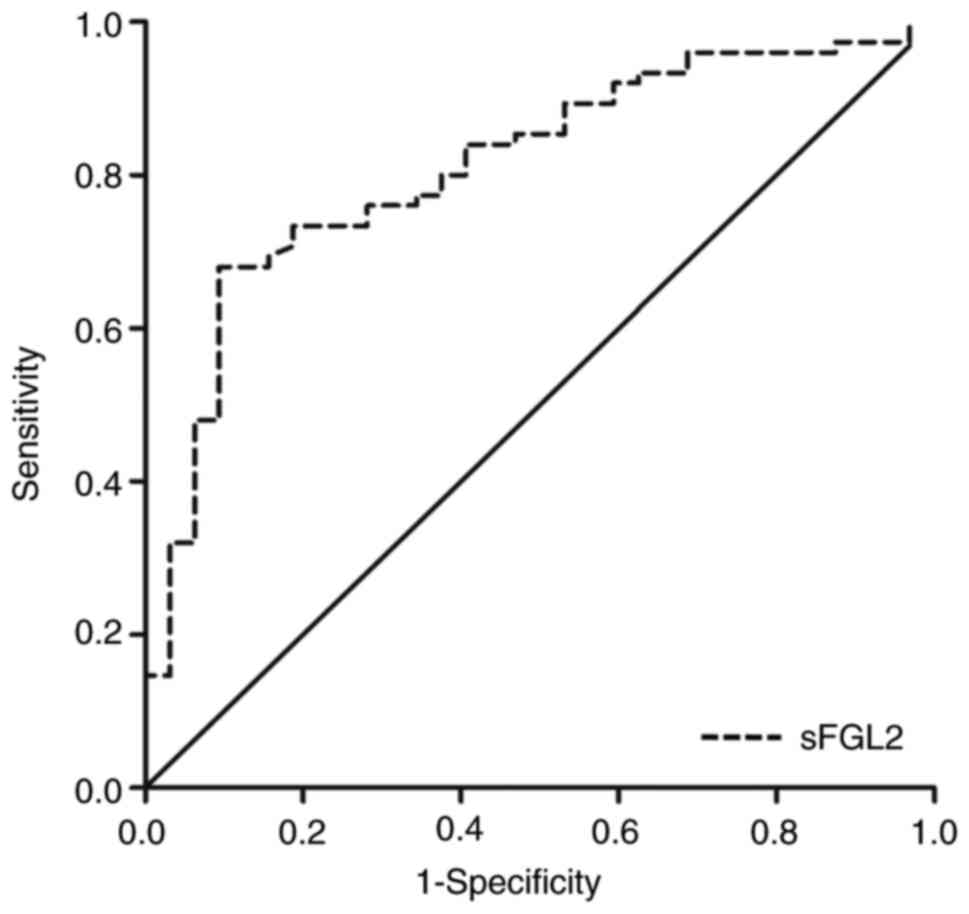 Continuous variables were expressed as mean ± standard deviation in text and figures. Unpaired two-tailed Student's t-test was performed to detect two group differences and one-way analysis of variance (ANOVA) with Bonferroni's post-hoc test for multiple comparisons. Categorical data were expressed as frequencies and Chi-square test was performed for comparisons between groups. Pearson's correlation coefficients were used to establish associations between variables. Cut-off values for serum sFGL2 levels predicting IHF were analyzed by receiver operating characteristic (ROC) curve analysis. GraphPad Prism 5.0 (GraphPad Software, Inc.) and SPSS 19.0 (IBM Corp.) software were used for data analysis. P<0.05 was considered to indicate a statistically significant difference.