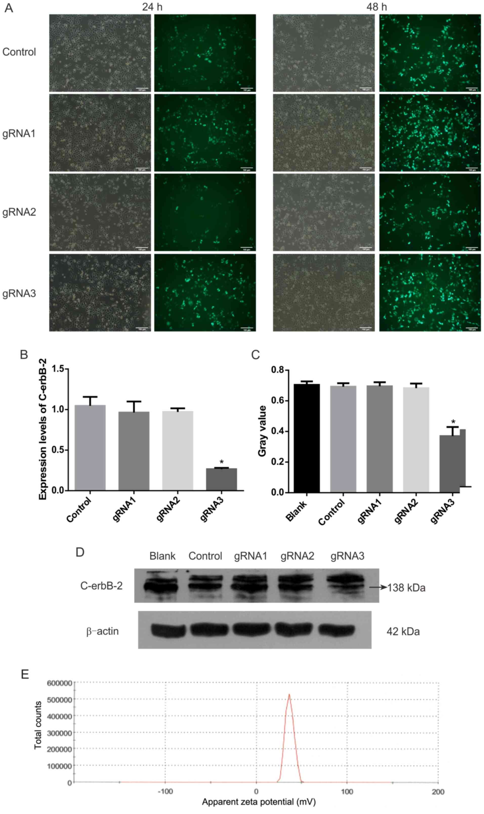 The sequences of three candidate gRNAs targeting C-erbB-2 were selected. For gRNA1, target 1 was 5′-TCATCGCTCACAACCAAGTG-3′ and target 2 was 5′-CAGGGGTGGTATTGTTCAGC-3′. For gRNA2, target 1 was 5′-TCATCGCTCACAACCAAGTG-3′ and target 2 was 5′-CGGGTCTCCATTGTCTAGCA-3′. For gRNA3, target 1 was 5′-CGCTCACAACCAAGTGAGGC-3′ and target 2 was 5′-ACAGGGGTGGTATTGTTCAG-3′.