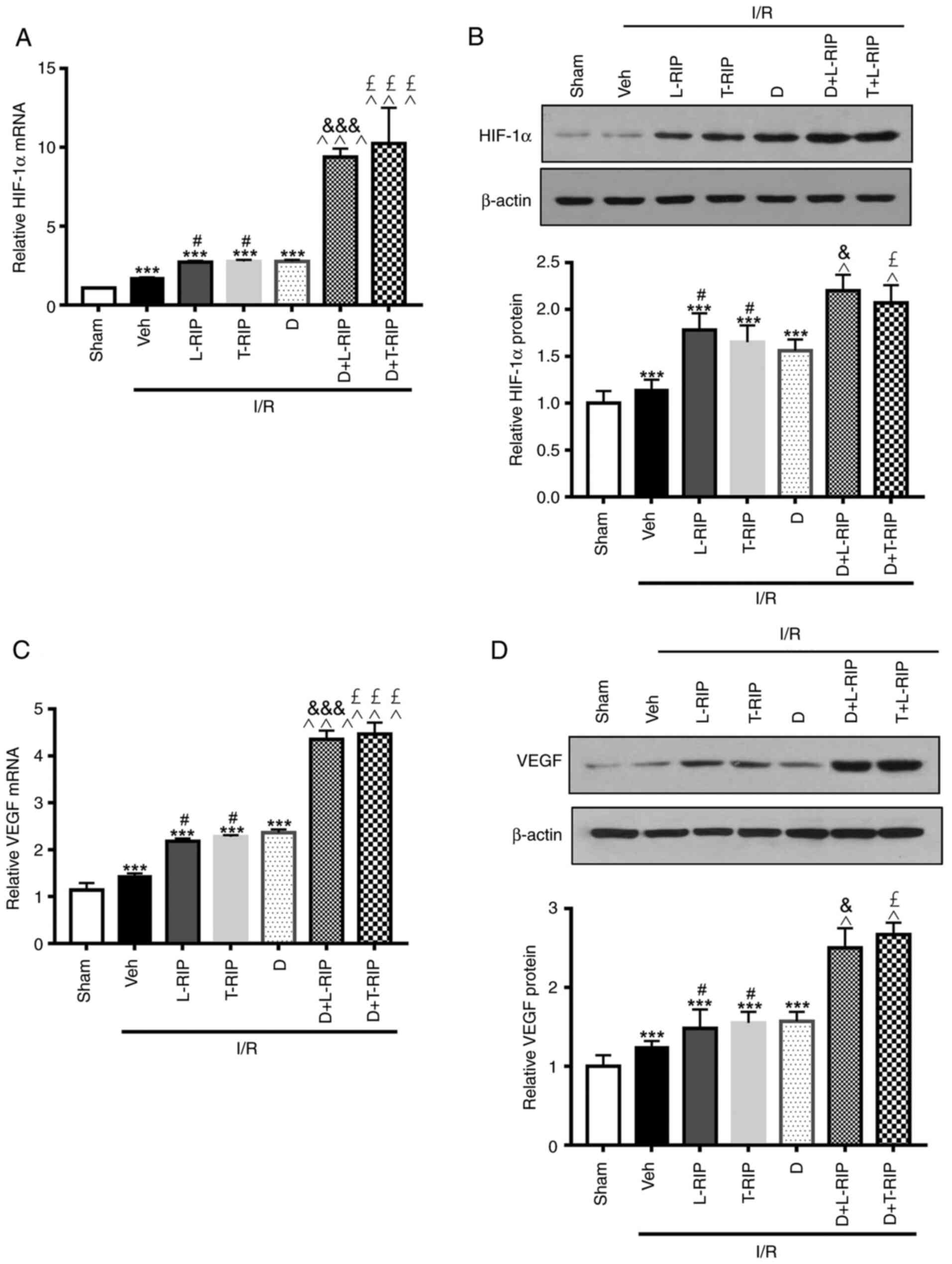 Similarly, both the mRNA and protein expression levels of VEGF, a downstream effector of HIF-1α, were significantly increased by I/R; this upregulation was further enhanced by L/T RIP and DMOG in I/R rabbits. As expected, L/T-RIP and DMOG had a greater effect on increasing VEGF mRNA and protein expression levels.