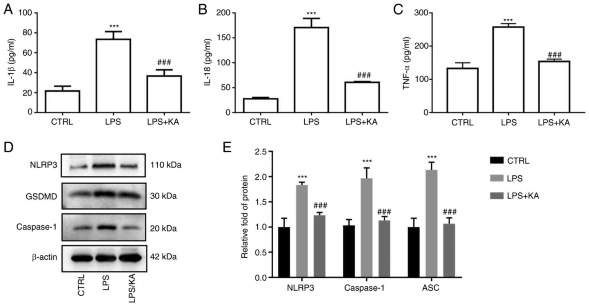 In conclusion, in the present study, it was found that KA significantly suppressed macrophage pyroptosis induced by LPS. We further demonstrated that the anti-pyroptotic effect of KA was achieved through activation of the NRF2 pathway.