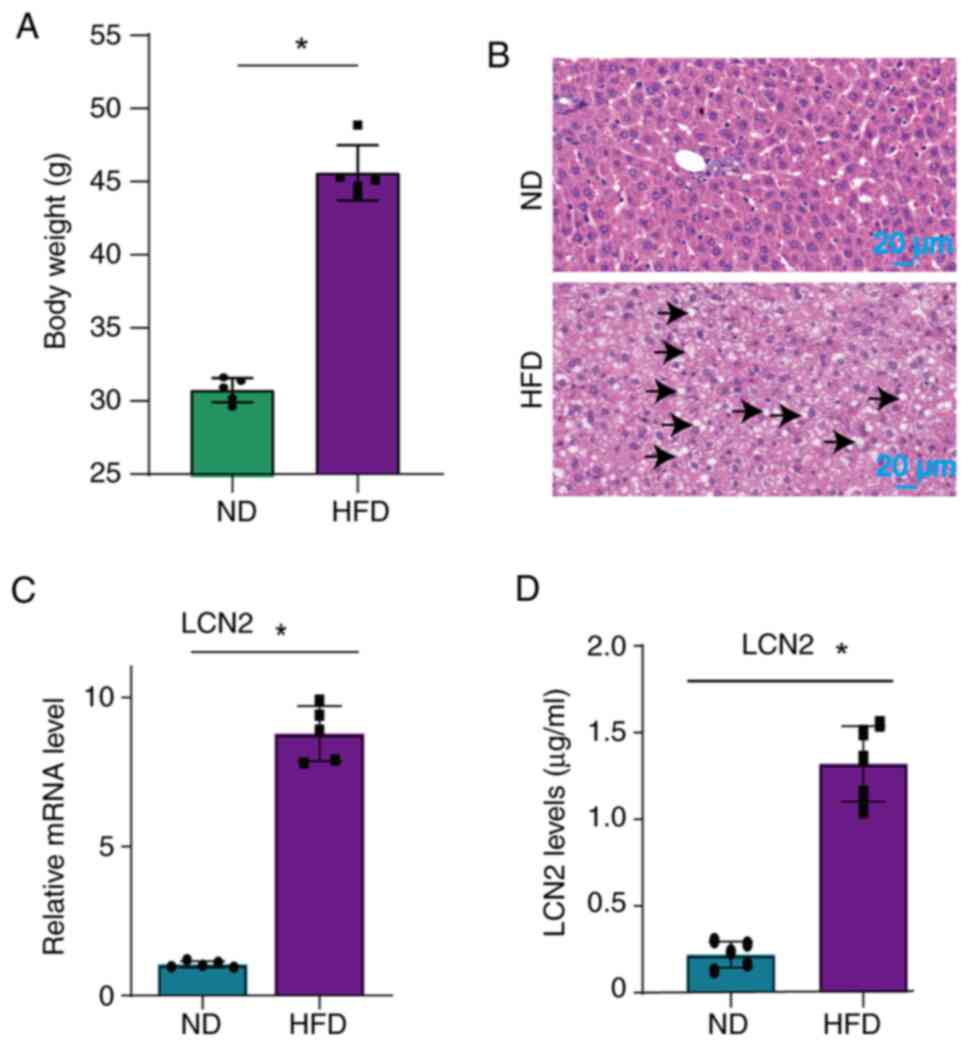 Liver tissues were collected for extraction of total RNA using a DNA/RNA co-extraction kit (cat. no. DP422; Tiangen Biotech Co., Ltd.). Subsequently, cDNA synthesis was carried out using the FastKing gDNA Dispelling RT SuperMix (cat. no. KR118; Tiangen Biotech Co., Ltd.) according to the manufacturer's instruction. qPCR was performed according to the protocol specified by the manufacturer of FastFire qPCR PreMix (SYBR Green) (cat. no. FP207; Tiangen Biotech Co., Ltd.). The qPCR program consisted of an initial phase of pre-denaturation at 95°C for 1 min, followed by 40 cycles at 95°C for 5 sec, 55°C for 10 sec and 72°C for 15 sec. For the expression analysis of the target genes, GAPDH was employed as the internal reference for normalization. The primer sequences were as follows, LCN2, F 5′-AAGGCAGCTTTACGATGT-3′, R 5′-TGGTTGTAGTCCGTGGTG-3′; GAPDH, F 5′-GCACAGTCAAGGCCGAGAAT-3′ and R 5′-GCCTTCTCCATGGTGGTGAA-3′. Data were normalized to GAPDH levels as a reference. Subsequently, the gene expression levels were calculated using the 2−ΔΔCq method (21).
