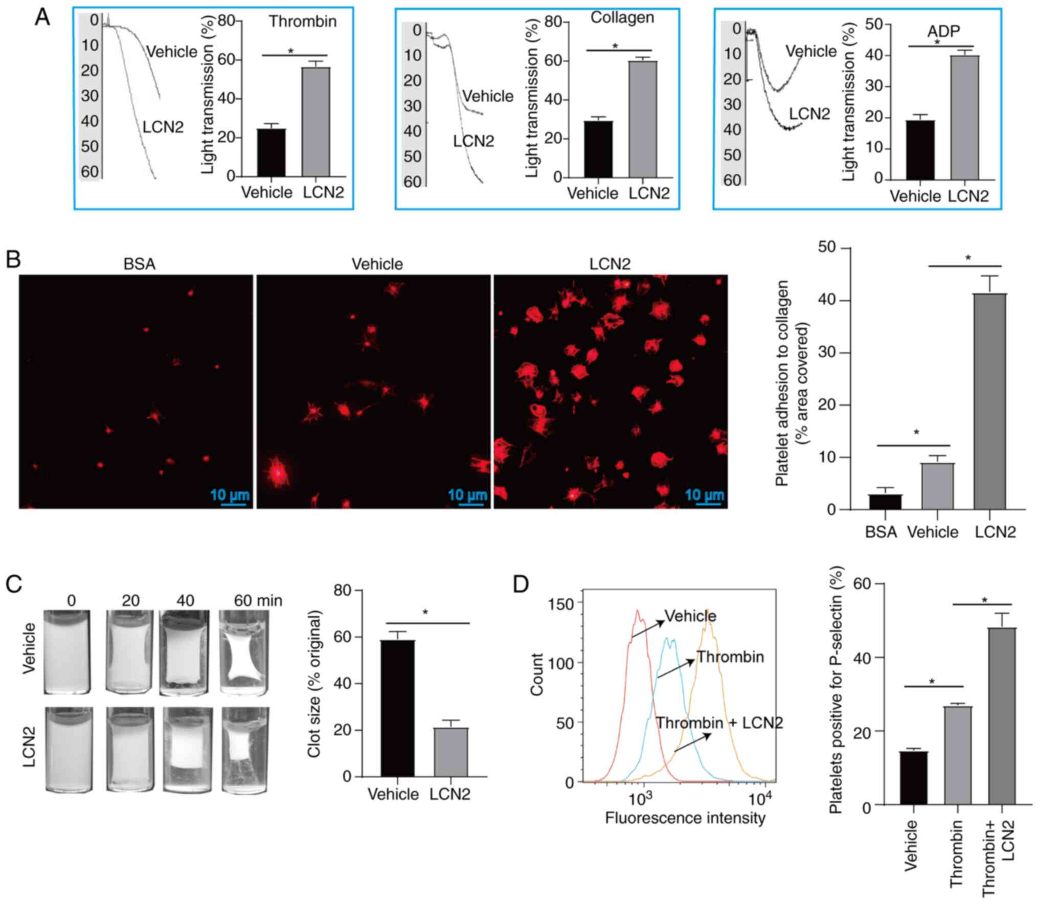 Platelets were incubated with or without LCN2 (2 µg/ml) for 5 min at 37°C, and subsequently stimulated with thrombin (0.4 U/ml) at 37°C. The process of clot retraction was monitored and recorded at intervals of 0, 20, 40 and 60 min after thrombin stimulation by capturing images of platelet clots.
