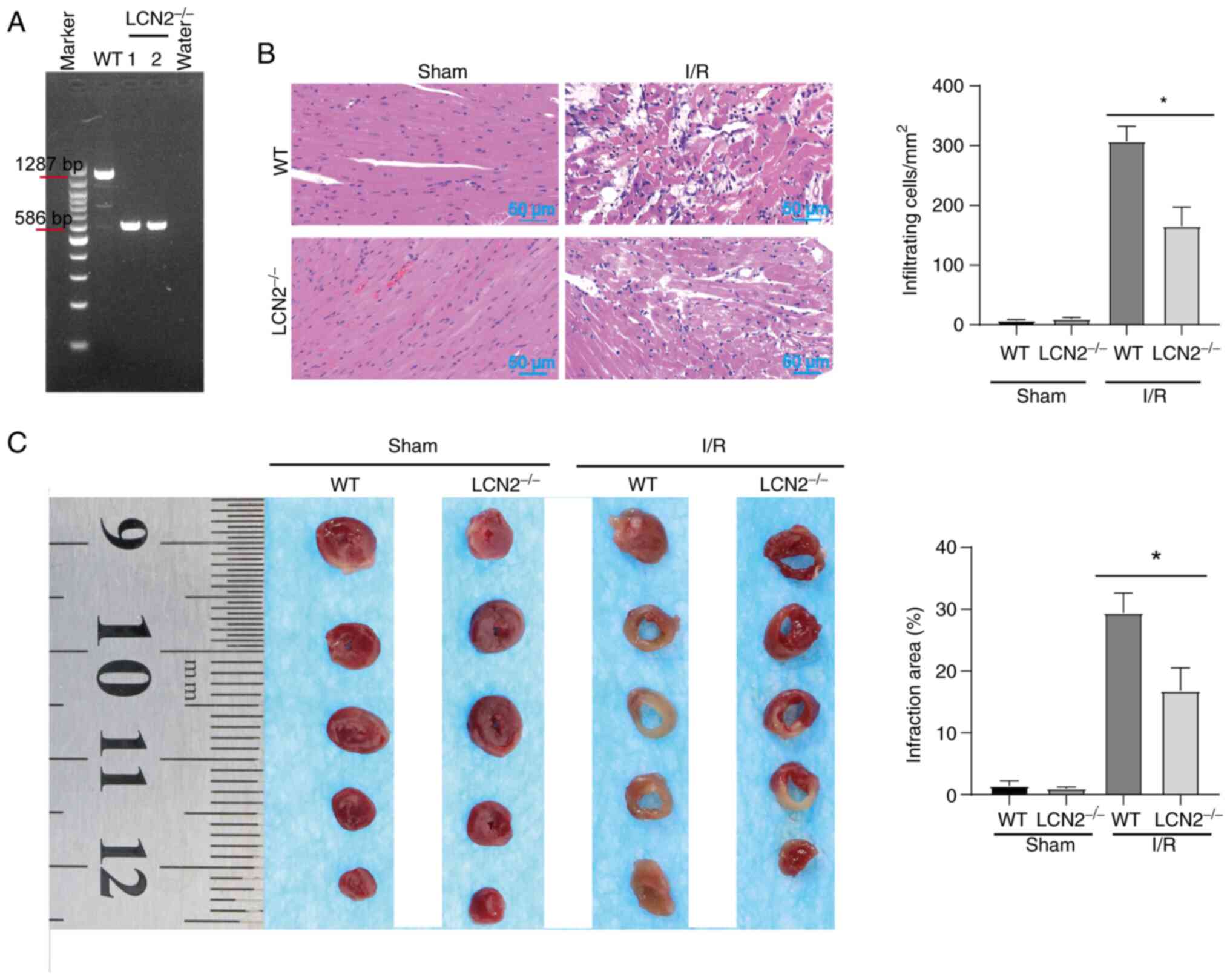 Obesity serves an important role in the development of cardiovascular diseases. One of the main contributors to MI/R injury in obese individuals is the increase in endogenous bioactive molecules, which stimulate platelet activation (25). The gene phenotypes of WT mice and LCN2−/− mice were determined by PCR (Fig. 3A). For WT mice, a PCR product of 1,287 bp was generated, whereas a PCR product of 586 bp was generated for LCN2−/− mice. The PCR product of 586 bp in LCN2−/− mice indicated that LCN2 was knocked out, whereas the PCR product of 1,287 bp in WT mice indicated that LCN2 was not knocked out. These mice were then subjected to MI/R injury or sham operation after being fed a HFD. Subsequently, cardiac pathology was observed by H&E staining (Fig. 3B). After sham operation, the myocardia of WT mice and LCN2−/− mice were closely arranged, with normal structure and no obvious inflammatory cell infiltration. WT mice and LCN2−/− mice with MI/R injury exhibited notable histological features of myocardial tissue injury and inflammatory cell infiltration. In the case of MI/R injury, there was less structural damage to the myocardium and relatively less inflammatory cell infiltration in LCN2−/− mice compared with that in the WT mice (Fig. 3B). TTC staining showed no obvious ischemic features in the myocardia after sham operation in WT mice and LCN2−/− mice. After MI/R injury, the myocardial infarct size of LCN2−/− mice was smaller than that of WT mice (Fig. 3C).