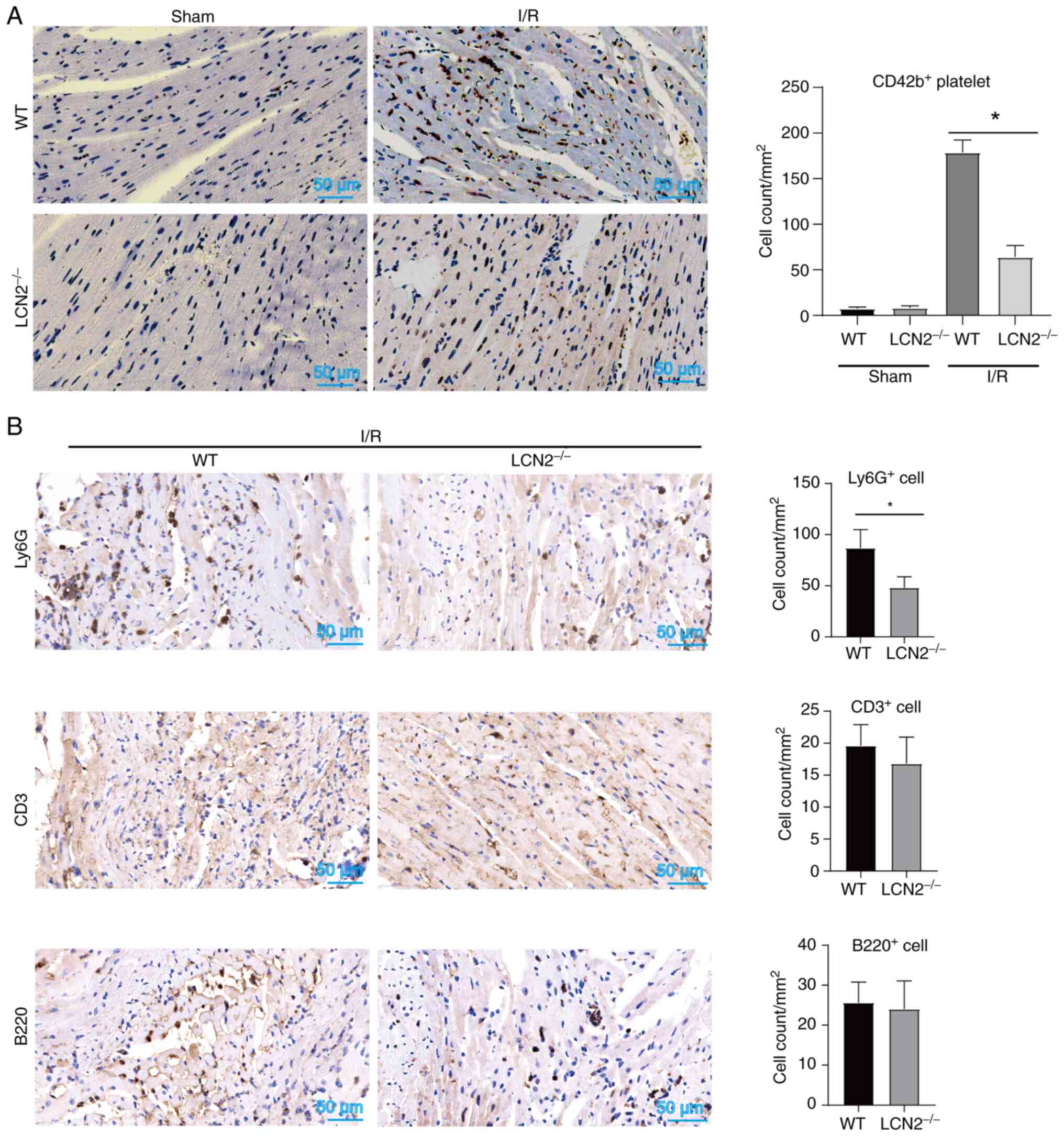 During MI/R injury, platelets tend to form microthrombi within the microvessels of the heart and worsen myocardial damage by releasing certain bioactive molecules (24). Thus, the current study aimed to investigate whether the absence of LCN2 affects the accumulation of platelets induced by I/R injury in myocardial tissue. As shown in Fig. 4A, the number of CD42b+ platelets in myocardial tissues was lower in LCN2−/− mice compared with that in WT mice following reperfusion post-ischemia. These findings suggested that LCN2 induced by HFD may enhance platelet accumulation in myocardial tissue during MI/R injury. Notably, activated platelets form complexes with leukocytes and adhere to microvessels within the heart, thereby exacerbating MI/R injury. Suppression of platelet activation can reduce the recruitment of inflammatory cells in myocardial tissue, ultimately mitigating MI/R injury (24,25). In the present study, it was observed that LCN2 gene knockout decreased the accumulation of Ly6G+ cells within the region of myocardial injury induced by I/R, while having no significant impact on the recruitment of CD3+ or B220+ cells (Fig. 4B). These results indicated that LCN2 knockout might alleviate MI/R injury by inhibiting platelet and Ly6G+ cell recruitment.