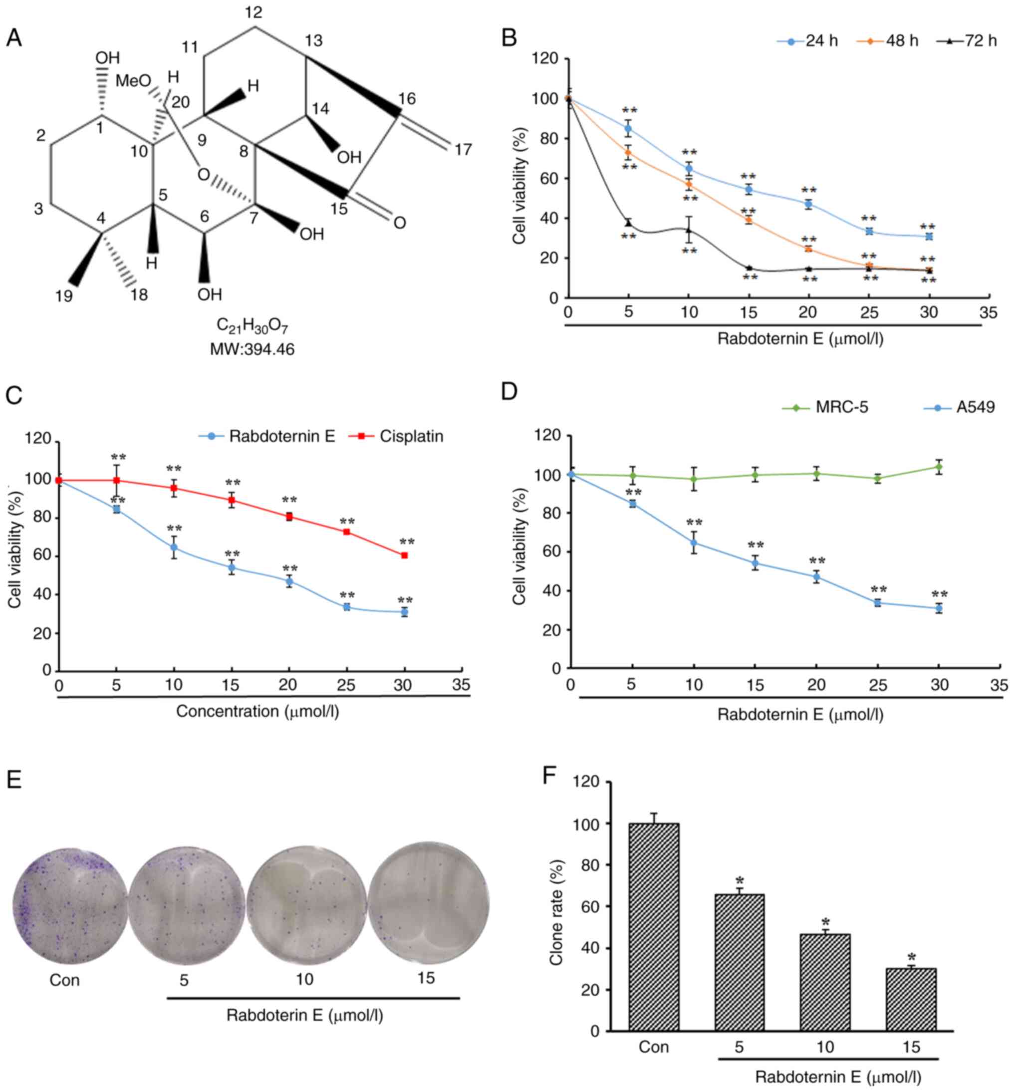 Rabdoternin E is an ent-kaurane diterpene monomer compound (Fig. 1A). The MTT method was used to detect the effects of rabdoternin E at different concentrations on the proliferation of A549 cells. The proliferation of A549 cells was significantly inhibited by rabdoternin E intervention (Fig. 1B). Rabdoternin E inhibited A549 cell proliferation jto a greater degree than cisplatin (positive control) during the 24-h period with the IC50 of rabdoternin E and cisplatin against A549 cells 16.45 and 39.52 µM, respectively (Fig. 1C). In order to verify whether rabdoternin E has cytotoxicity on normal lung cells at tested concentrations for 24 h, the human embryonic lung fibroblast cell line MRC-5 was selected for cytotoxicity tests. The rabdoternin E had no toxic effect on MRC-5 cells at the tested concentrations (Fig. 1D). To further examine the inhibition of rabdoternin E on the proliferation of A549 cells, a clone formation assay was used to investigate the results. The number of cell clones significantly declined in a dose-dependent manner (Fig. 1E and F), which macroscopically confirms that rabdoternin E can significantly inhibit the proliferation of A549 cells.
