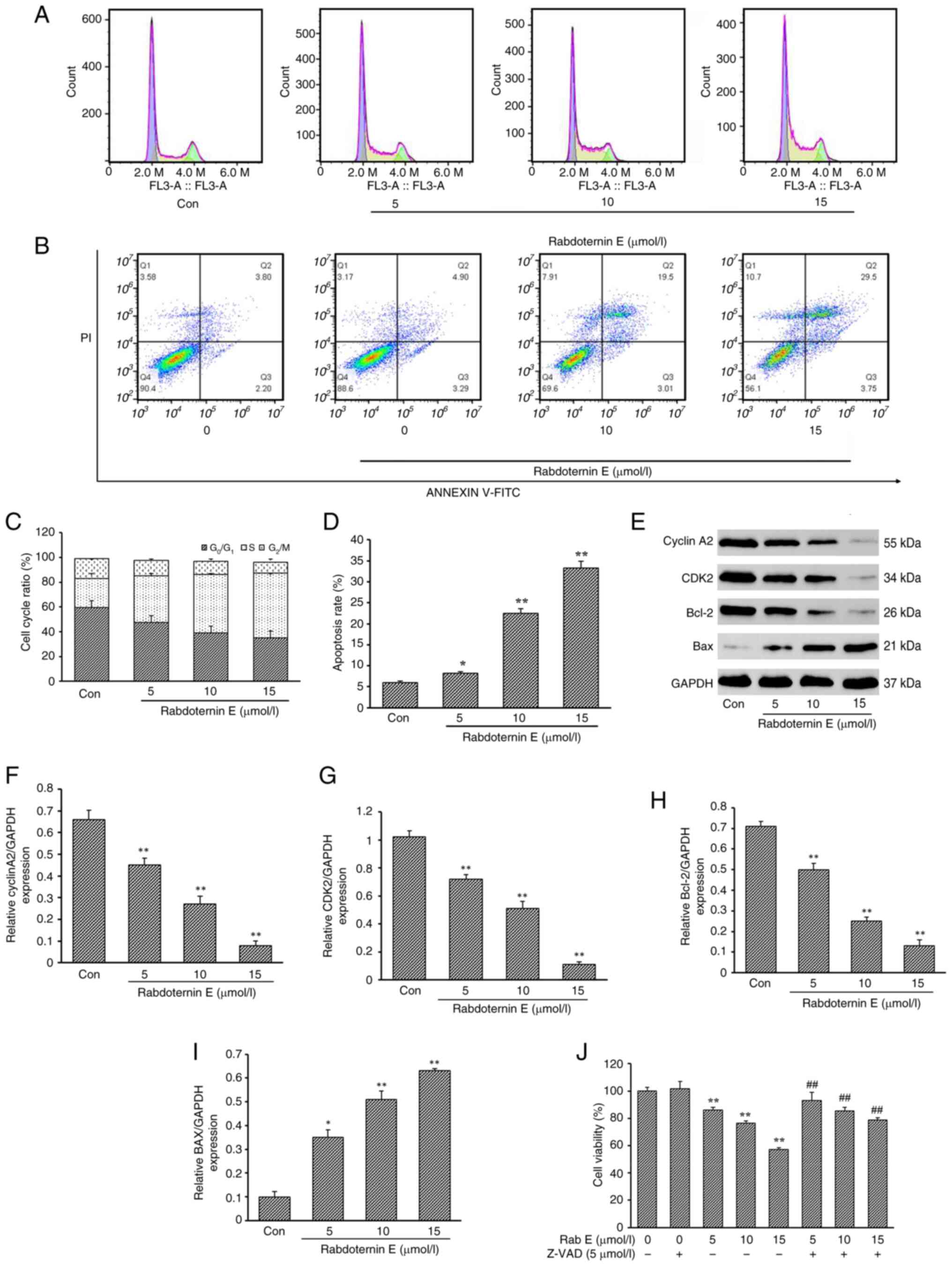 Cell cycle progression is closely related to cell proliferation and complete and orderly cycle progression is the key to cell growth and proliferation (19,20). Compared with the control (Con) group, the proportion of cells in the S-phase in the rabdoternin E group significantly increased in a dose-dependent manner (Fig. 2A and C). When the dose of rabdoternin E reached 15 µM, the proportion of cells in the S phase reached 52.2%. The apoptosis rates in the Con group and rabdoternin E group at concentrations of 5, 10 and 15 µM for 24 h were 6.00, 8.19, 22.51 and 33.25%, respectively (Fig. 2B and D). The apoptosis rate in all tested groups was higher than that in the Con group (P<0.05 or P<0.01). As shown in Fig. 2E-I, Bax and Bcl-2 were dose-dependently up- and downregulated, respectively and the Bax/Bcl-2 ratio increased. Moreover, the expression of S-phase related proteins CDK2 and Cyclin A2 decreased significantly with the increase of the rabdoternin E concentration. Finally, rabdoternin E and the apoptosis inhibitor Z-VAD-FMK (10 µM) were co-cultured for 24 h. Z-VAD-FMK reversed the cytotoxicity of rabdoternin E on A549 cells by ~10% (P<0.05 or P<0.01), indicating that rabdoternin E induces apoptosis in A549 cells (Fig. 2J). However, apoptosis is not the only cause of drug-induced cell death and the effects of rabdoternin E may be caused by other forms of cell death (21,22).