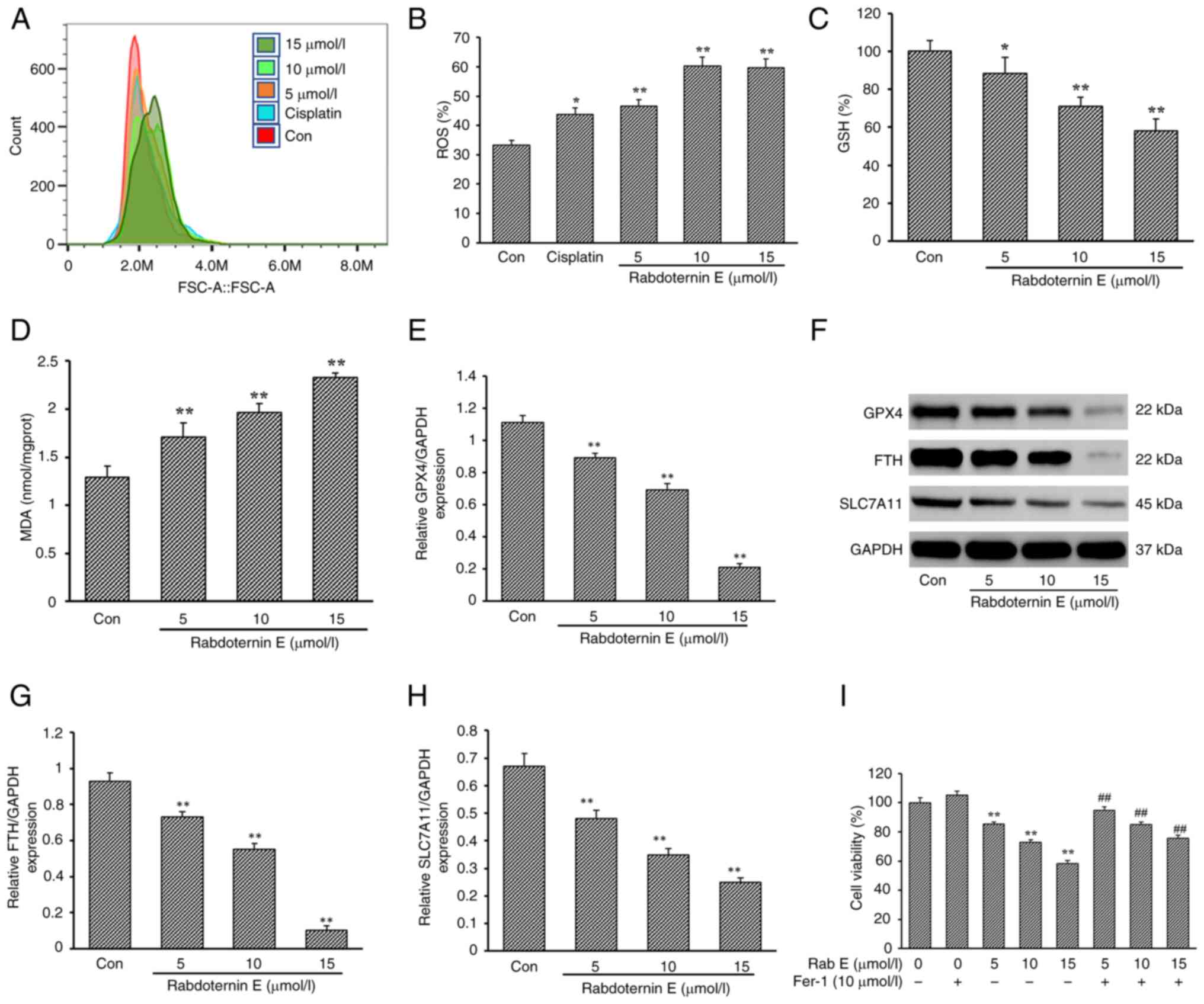In the process of cancer treatment, drug stimulation can increase the level of ROS expression, which in turn induces apoptosis and serves to inhibit the proliferation and spread of cancer cells (23,24). Meanwhile, the accumulation of ROS can induce the occurrence of intracellular ferroptosis (25,26). In the present study, the level of ROS following rabdoternin E treatment significantly increased in a dose-dependent manner (Fig. 3A and B). A previous studies showed that ROS accumulation disrupts GSH/GSSH homeostasis, causing GSH depletion, inducing lipid peroxidation and leading to the occurrence of ferroptosis (27,28). Combined with the fact that the apoptosis inhibitor Z-VAD-FMK and rabdoternin E co-culture did not completely reverse the proliferation inhibitory effect of rabdoternin E on A549 cells, changes in GSH and MDA (indicators associated with ferroptosis) levels after 24 h of rabdoternin E treatment were examined. Rabdoternin E caused intracellular GSH depletion and MDA accumulation in a dose-dependent manner (P<0.05 or P<0.01, respectively; Fig. 3C and D), indicating the occurrence of ferroptosis in cells.