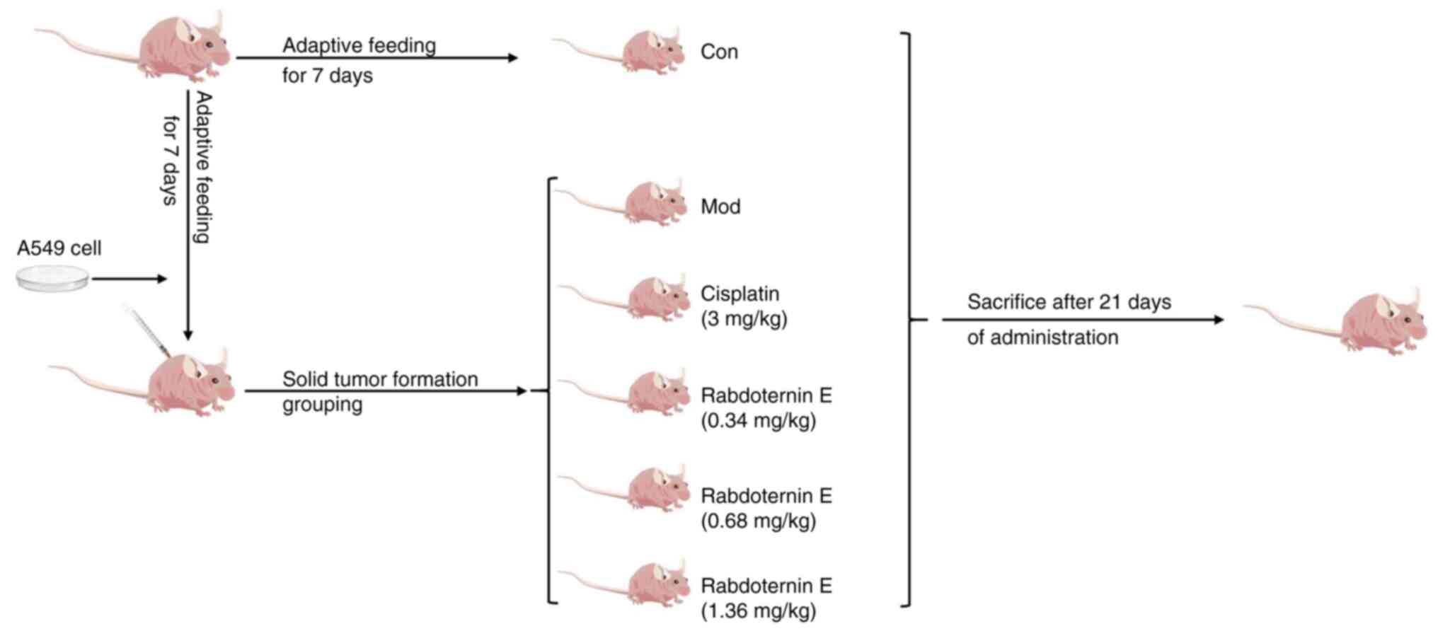 A total of 30 male BALB/c nude mice (4–6 weeks old; 18–20 g) were purchased from Beijing Vital River Laboratory Animal Technology Co., Ltd. They were given free access to food and water and kept in an SPF environment. The temperature in the environment was 24±2°C, the relative humidity was 60%, and 12-h light/dark cycle. All experimental procedures were accomplished complying with the guidelines for the Care and Use of Laboratory Animals of Henan University of Chinese Medicine and approved by The Animal Experiments and Experimental Animal Management Committee from The Henan University of Chinese Medicine (Zhengzhou, China; approval no. DWLL202207009). BALB/c mice were injected subcutaneously with a total of 2×106 A549 cells in the left forelimb. At 4 days after A549 inoculation, the mice were randomly divided into five groups (n=6/per group) including: i) Model group; ii) positive group (3 mg/kg cisplatin); iii) low rabdoternin E group (0.34 mg/kg); iv) medium rabdoternin E group (0.68 mg/kg); and v) high rabdoternin E group (1.36 mg/kg). Drug intervention groups were administered cisplatin or rabdoternin E by gavage for 15 consecutive days and the model group received the saline equivalent. The mice were weighed and tumor volume was measured with calipers every 3 days to track tumor growth and calculated according to the following formula: 0.5× length × width2. The mice were sacrificed under deep anesthesia and tumor tissue was excised. No drugs were used to sacrifice the mice in this study. At the end of the experiment, Mice were anesthetized with 40 mg/kg pentobarbital sodium solution by intraperitoneal injection, blood was collected under anesthesia through heart puncture and then the mice were sacrificed by cervical dislocation and the collected samples were subsequently preserved at −80°C for future use.