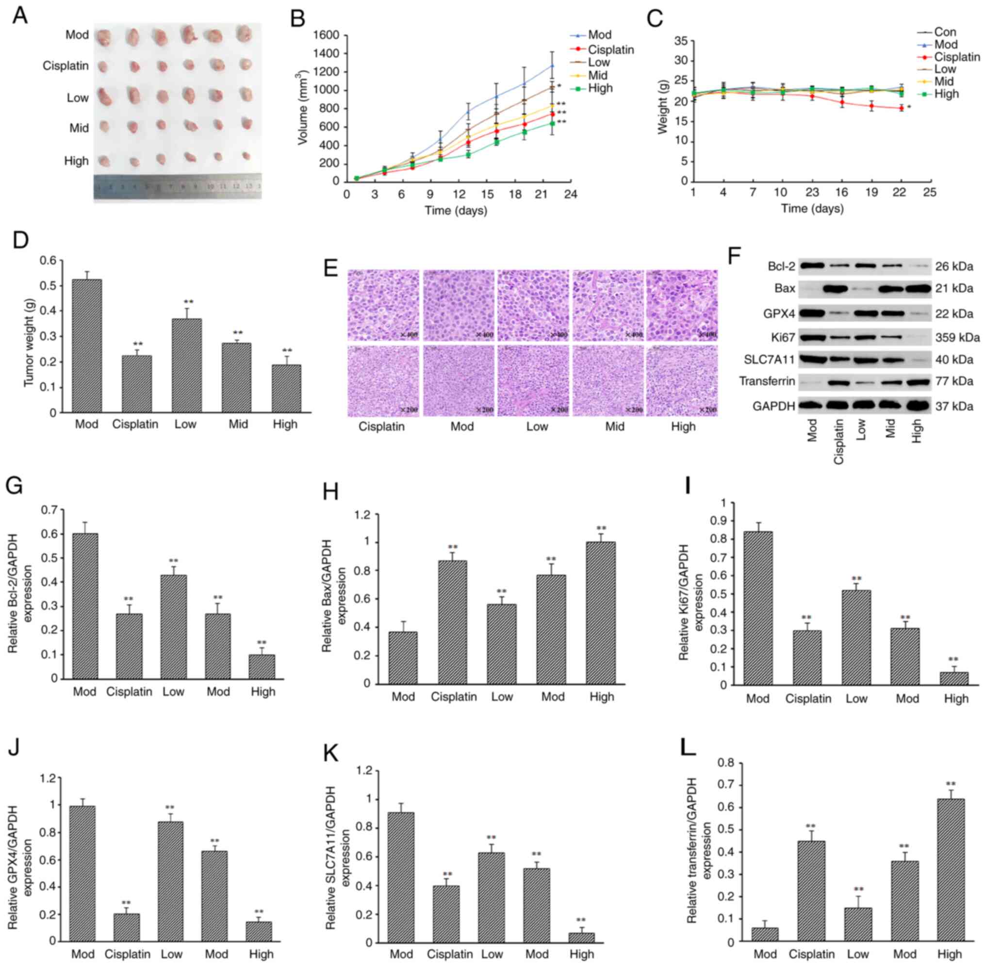 To verify the anti-tumor effect of rabdoternin E in vivo using a Lewis lung carcinoma mouse model, BALB/c mice were treated with rabdoternin E for 21 days (Fig. 5). The tumor volume and mass in the rabdoternin E group at all doses was significantly reduced compared with the model group of BALB/c nude mice and those of the high and middle dosage rabdoternin E group were smaller compared with the cisplatin group (Fig. 6A, B and D). Moreover, all tested doses of rabdoternin E did not significantly affect the body weight of BALB/c nude mice, indicating that rabdoternin E had no significant toxic side effects in the mice, but the positive dose group showed the greatest change in body weight, with a 14.82% decrease in body weight from the beginning of the experiment to the end of the experiment (Fig. 6C). H&E staining showed that the tumor cells were regularly, neatly and tightly packed in the model group, while those in the rabdoternin E groups were disorganized with large cell gaps, severely vacuolated and the number significantly reduced, suggesting rabdoternin E significantly inhibited the proliferation of A549 cell (Fig. 6E). rabdoternin E treatment significantly decreased the expressions of Bcl-2, Ki67, GPX4 and SLC7A11 (P<0.01) and increased those of Bax and transferrin in the tumor tissues (Fig. 6F-L), indicating that rabdoternin E induces apoptosis and iron death via ROS-dependent p38 MAPK/JNK pathway activation.