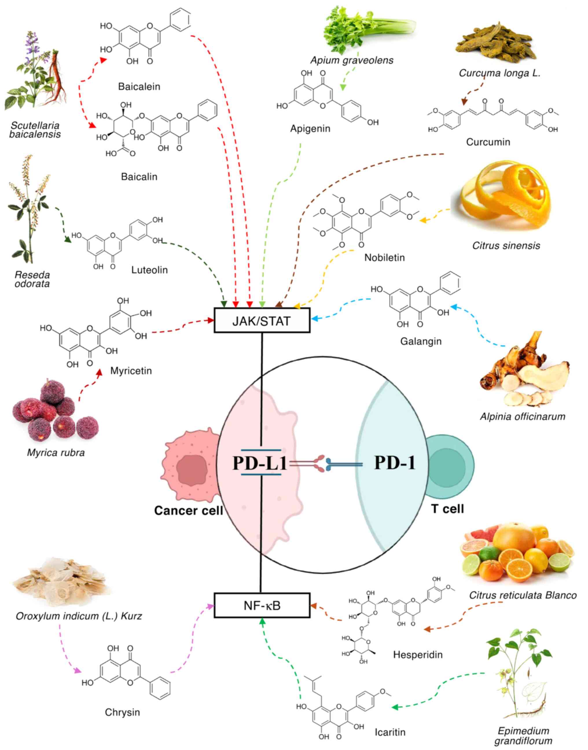 Zhong Y, Li MY, Han L, Tai Y, Cao S, Li J, Zhao H, Wang R, Lv B, Shan Z, et al: Galangin inhibits programmed cell death-ligand 1 expression by suppres sing STAT3 and MYC and enhances T cell tumor-killing activity. Phytomedicine. 116:1548772023. View Article : Google Scholar : PubMed/NCBI | |