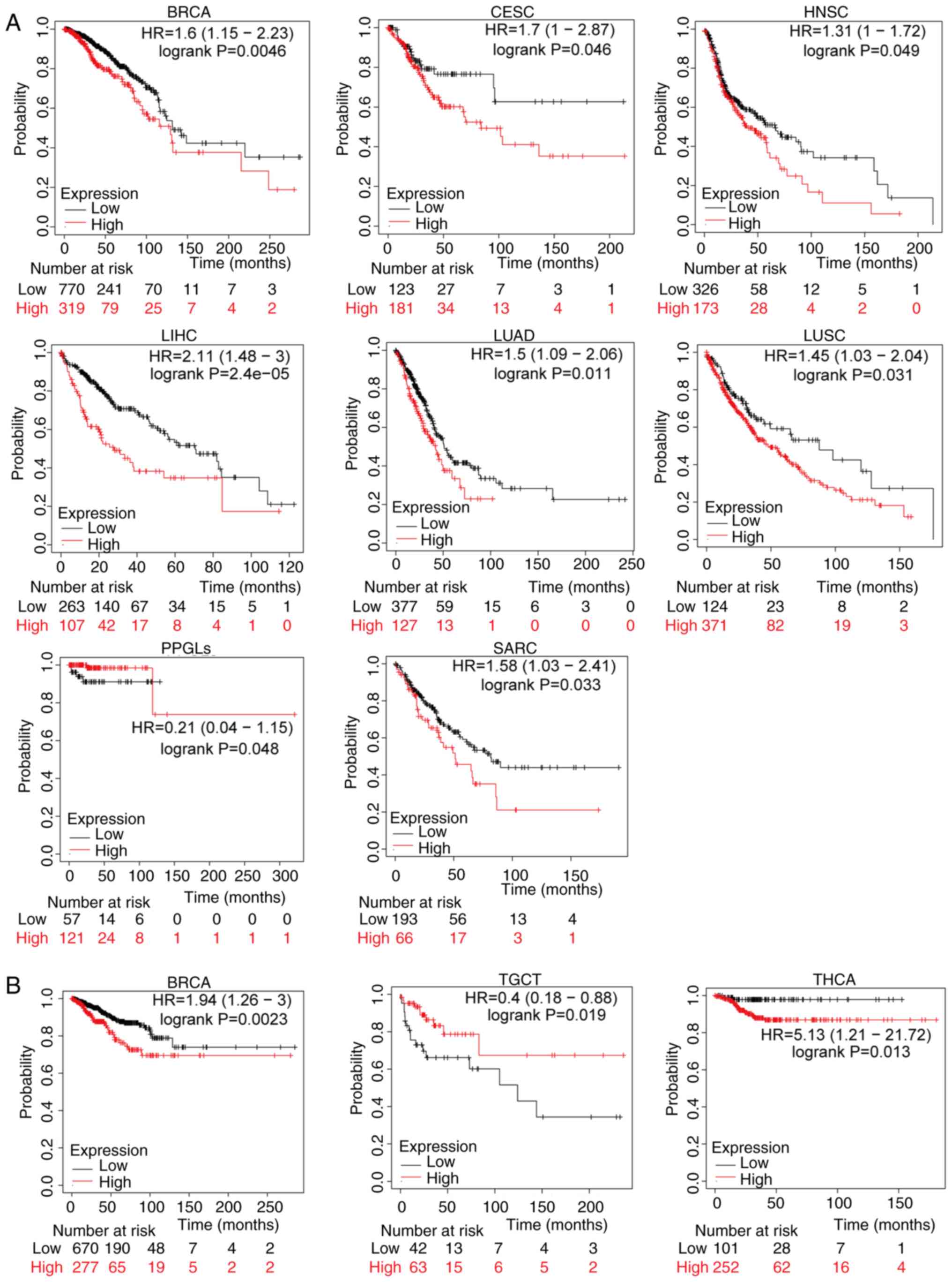 Kaplan-Meier analysis was used to assess the relationship between WSB2 expression levels and survival prognosis in patients with cancer. Analysis revealed that in BRCA, CESC, HNSC, LIHC, LUAD, LUSC, paraganglioma-pheochromocytoma syndromes and sarcoma), increased expression of WSB2 was associated with shorter OS (Fig. 3A). In addition, increased expression of WSB2 was associated with shorter RFS in BRCA and THCA, and decreased WSB2 expression was associated with poor prognosis of patients with TGCT (Fig. 3B)