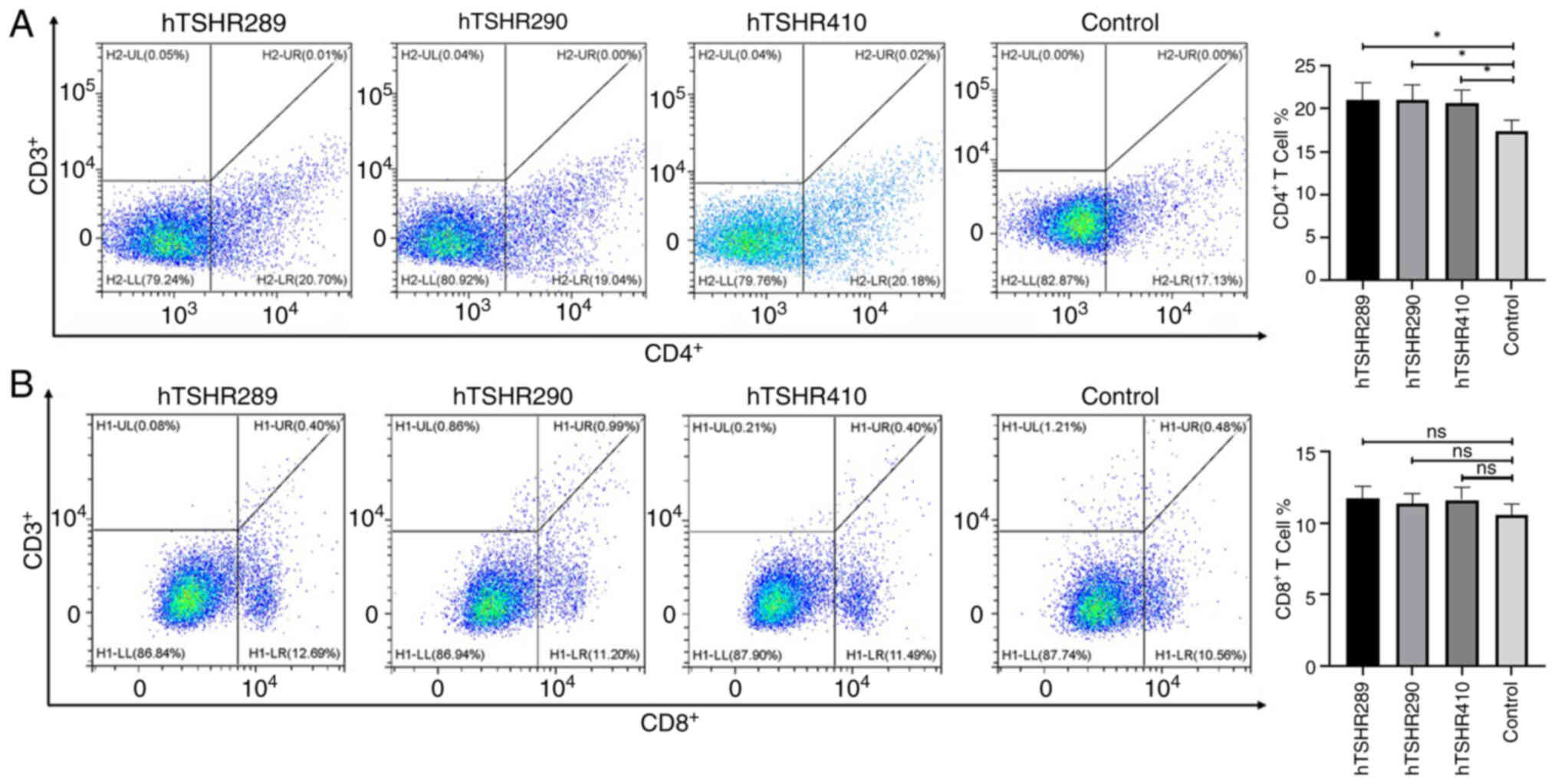 In the present study, the immune response was further investigated following the immunization of mice with three types of hTSHR fusion proteins as antigens. Flow cytometry was utilized to determine the proportions of CD4+ and CD8+ T cells in splenocytes of each group of mice. The proportion of CD4+ T cells in the three immunization groups was increased compared with that in the control group, and the difference was statistically significant. The proportion of CD8+ T cells in the three immunization groups was increased compared with that in the control group; however, the difference was not statistically significant (Fig. 6).