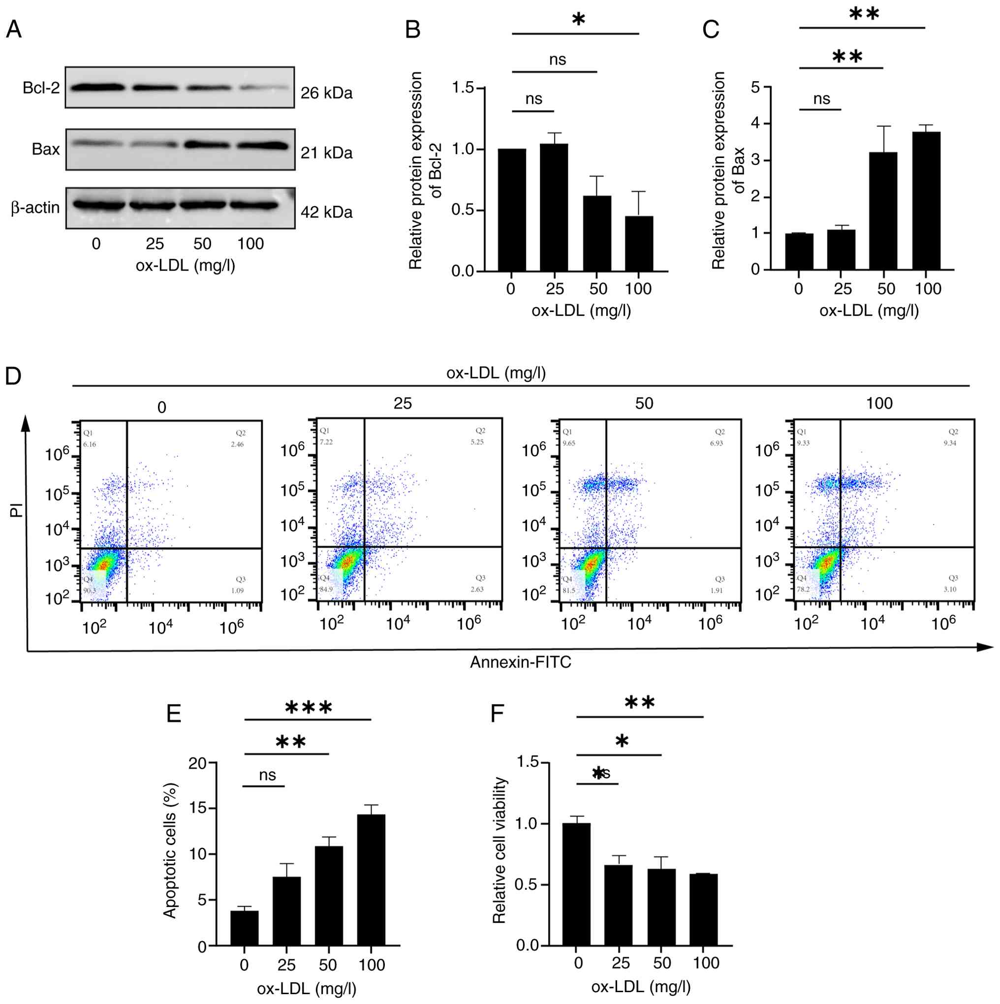 To establish a model of endothelial cell apoptosis, HUVECs were treated with various concentrations of ox-LDL. Prior to stimulation, HUVECs were serum-starved for 12 h, then exposed to a gradient of ox-LDL concentrations (0, 25, 50 and 100 mg/l). After 48 h of treatment, protein levels (via western blotting), apoptosis (via flow cytometry) and cell viability (via CCK-8 assay) were assessed to determine the optimal ox-LDL concentration. The pro-apoptotic marker Bax and anti-apoptotic marker Bcl-2 were used to evaluate apoptotic signaling. Western blot analysis revealed a significant decrease in Bcl-2 expression and a significant increase in Bax expression following 48 h of treatment with 100 mg/l ox-LDL (Fig. 1A-C). Flow cytometric analysis showed that 100 mg/l ox-LDL significantly increased the apoptotic rate, defined as the sum of late apoptotic cells (second quartile Q2: Annexin V+/PI+) and early apoptotic cells (third quartile Q3: Annexin V+/PI−), (Q2 + -Q3) from 2.46+1.09% in the 0 mg/l group to 9.34+3.10% (Fig. 1D and E). Notably, Fig. 1D displays the quantitative proportions of the four quadrants in the flow cytometric apoptosis analysis, including the Q1 quadrant (necrotic cells), Q2 quadrant (late apoptotic cells), Q3 quadrant (early apoptotic cells) and Q4 quadrant (viable cells). Fig. 1E shows a quantitative histogram depicting the total apoptosis rate across different treatment groups (0, 25, 50 and 100 mg/l ox-LDL), defined as the sum of the percentages of cells in the Q2 (late apoptosis) and Q3 (early apoptosis) quadrants. Furthermore, 100 mg/l ox-LDL significantly decreased cell viability compared with untreated cells (Fig. 1F). Based on the results shown in Fig. 1, 100 mg/l ox-LDL induced a strong pro-apoptotic effect in HUVECs. Therefore, this concentration was selected for subsequent experiments.