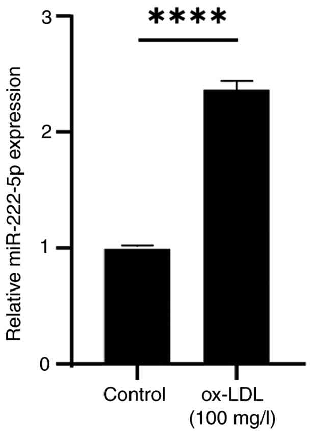 Previous studies have revealed that miR-222-5p expression is significantly higher in the serum of atherosclerotic mice compared with in age-matched healthy C57BL/6J mice (7), and in patients with AS compared with in healthy individuals without AS or any cardiovascular comorbidities (20), implicating its role in AS pathogenesis. Although high expression of miR-222-5p in AS has been reported, its specific function and molecular mechanism in ox-LDL-induced endothelial cell apoptosis have yet to be clarified.
