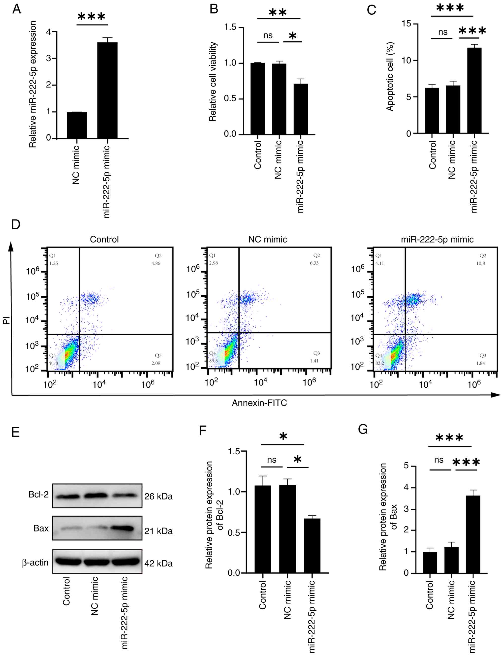 To further assess whether increased miR-222-5p levels influenced endothelial apoptosis, HUVECs were transfected with a miR-222-5p mimic using liposome-mediated delivery. Cells were transfected with either a miR-222-5p mimic to induce miR-222-5p overexpression or an NC mimic, and RT-qPCR was used to quantify miR-222-5p expression. The results showed that miR-222-5p expression in the overexpression group was ~361% higher than that in the control group (Fig. 3A). Subsequently, apoptosis-related parameters were evaluated, including cell viability (via CCK-8 assay), apoptosis rate (via flow cytometry) and Bax/Bcl-2 protein levels (via western blotting). The CCK-8 assay demonstrated that transfection with the miR-222-5p mimic significantly reduced cell viability compared with that in the control groups (Fig. 3B), indicating impaired endothelial cell proliferation. Flow cytometric analysis revealed that compared with in the NC group (6.33+1.41%, Q2 + Q3), the miR-222-5p overexpression group (10.80+1.84%, Q2 + Q3) exhibited significantly elevated total apoptosis rates [(including late apoptotic cells (Q2: Annexin V+/PI+) and early apoptotic cells (Q3: Annexin V+/PI−] (Fig. 3C and D). Fig. 3D displays the scatter plot (Q1-Q4), whereas Fig. 3C presents the combined total apoptosis rate for Q2/Q3. Consistently, western blot analysis showed that miR-222-5p mimic transfection significantly increased Bax expression and significantly decreased Bcl-2 expression compared with those in the control groups (Fig. 3E-G). Taken together, these results indicated that miR-222-5p promoted endothelial cell apoptosis.