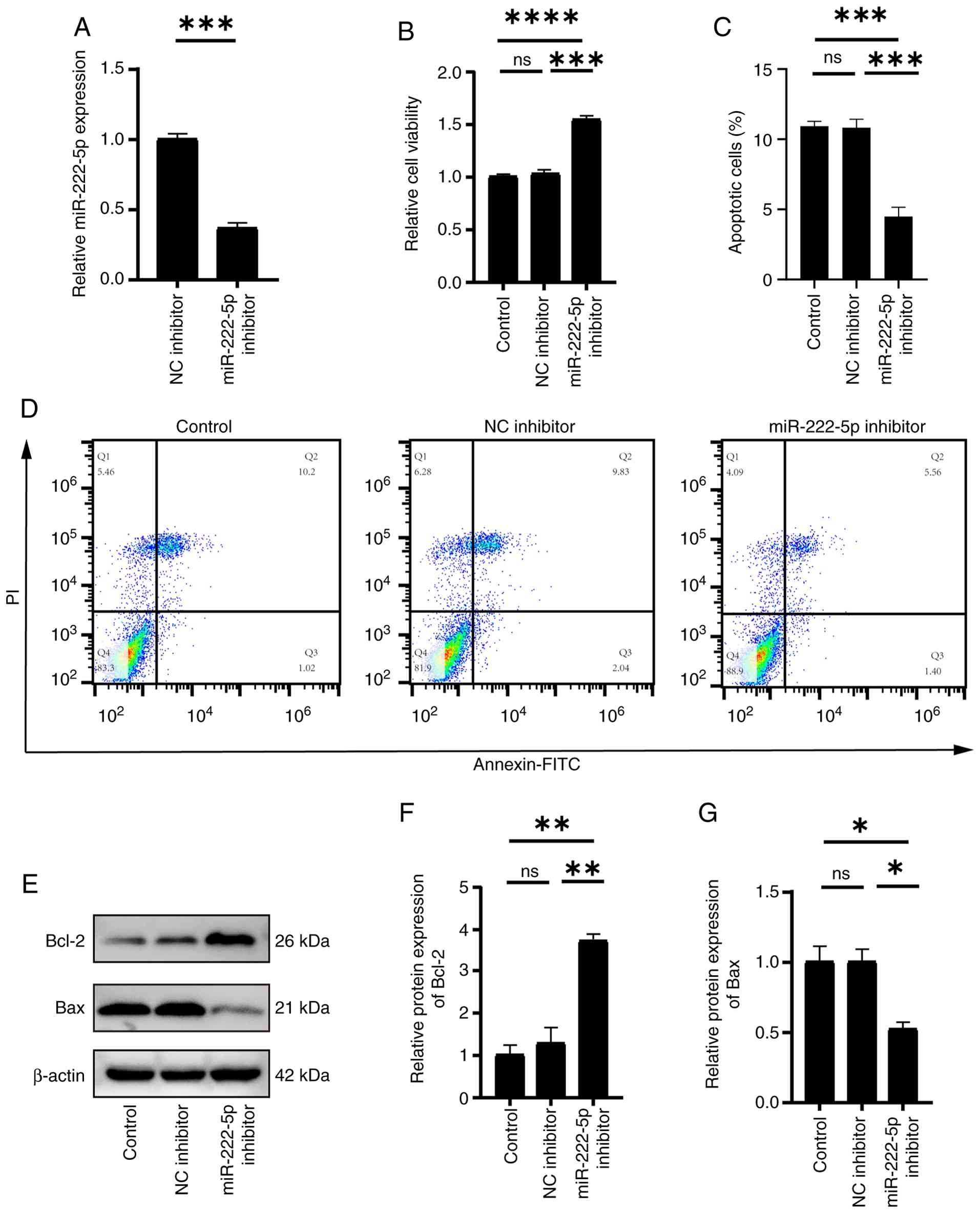 To further validate the role of miR-222-5p in endothelial cell apoptosis, HUVECs were transfected with a miR-222-5p inhibitor. RT-qPCR confirmed that the inhibitor significantly suppressed ox-LDL-induced miR-222-5p expression compared with the NC (Fig. 4A). The CCK-8 assay revealed that miR-222-5p inhibition significantly enhanced cell viability (Fig. 4B), whereas flow cytometry analysis revealed that the total apoptosis rate [sum of late apoptotic cells (Q2: Annexin V+/PI+) and early apoptotic cells (Q3: Annexin V+/PI−] in HUVECs significantly decreased from 9.83+2.04% (Q2 + Q3) in the NC inhibitor group to 5.56+1.40% (Q2 + Q3) in the miR-222-5p inhibitor group (Fig. 4C and D). Fig. 4D displays a dot plot (Q1-Q4 distribution), while Fig. 4C presents the combined total apoptosis rate (Q2 + Q3). Furthermore, in endothelial cells treated with the miR-222-5p inhibitor, Bax expression was significantly reduced, whereas Bcl-2 expression was significantly increased compared with those in the control groups (Fig. 4E-G). In summary, these results indicated that the miR-222-5p inhibitor mitigated ox-LDL-induced endothelial cell apoptosis.