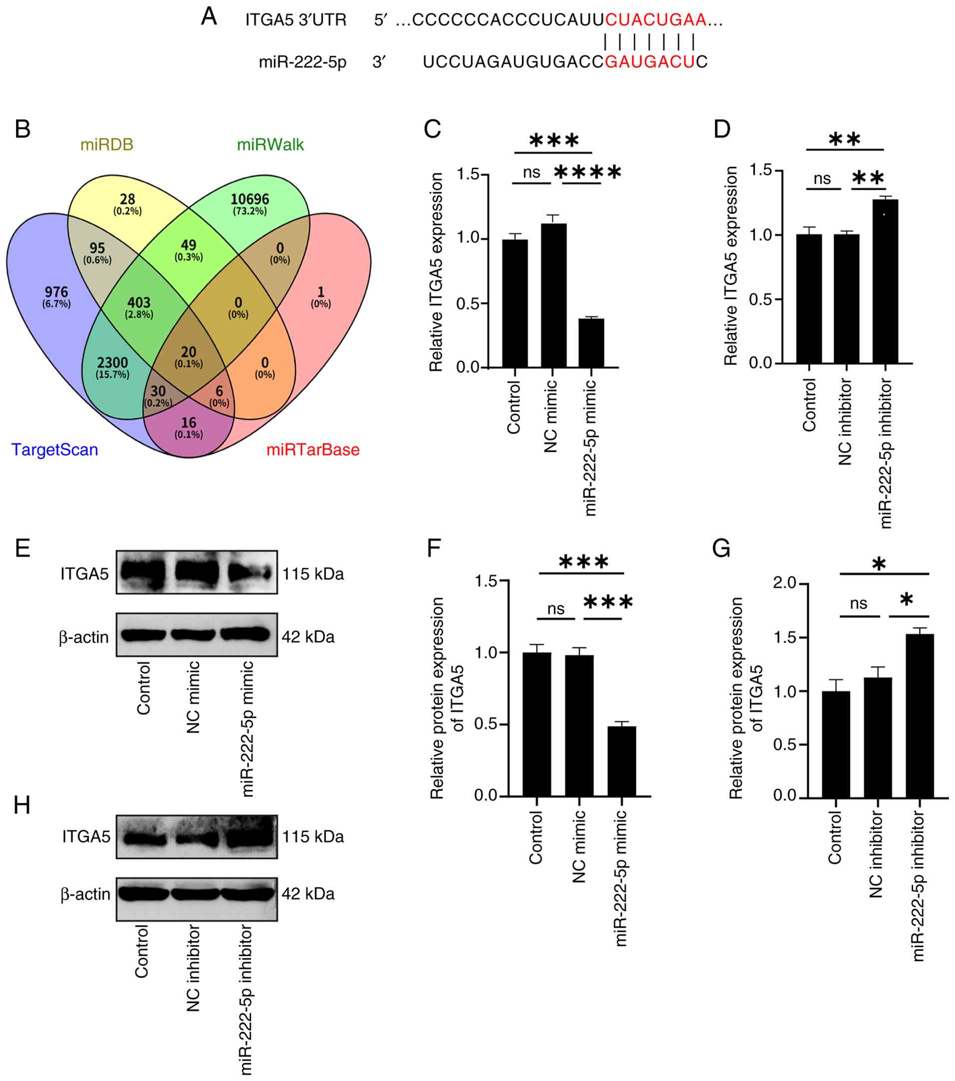The present study did not deny that miR-222-5p may regulate cell phenotypes through other target genes, as the multi-target nature of miRNAs is a common phenomenon (57). In the future, other potential target genes may be identified through high-throughput screening techniques, such as RNA-sequencing. In addition, luciferase reporter gene experiments, using ITGA5 3′UTR wild-type and binding-site mutant vectors, with co-transfection of a miR-222-5p mimic to detect differences in fluorescence activity, are critical for directly verifying the binding specificity between miR-222-5p and ITGA5. While this experiment was not performed in the present study, the conclusions regarding their regulatory relationship are supported by complementary evidence, including consistent bioinformatics predictions, inverse expression trends and functional rescue assays. Regarding the negative regulation of miR-222-5p on ITGA5, specifically, the expression levels of miR-222-5p were detected in HUVECs treated with 100 mg/l ox-LDL via RT-qPCR, and the expression level of ITGA5 were assessed using western blotting and RT-qPCR. The results showed that miR-222-5p expression was increased, while ITGA5 expression was decreased. Similarly, miR-222-5p overexpression led to decreased ITGA5 mRNA and protein levels, whereas miR-222-5p inhibition increased ITGA5 mRNA and protein expression. These findings indicated a negative association between miR-222-5p and ITGA5 expression, supporting a potential regulatory relationship between the two. This key validation step will be addressed in follow-up studies to further confirm the direct interaction. Furthermore, we aim to collect clinical samples from patients with AS to detect the expression levels of miR-222-5p and ITGA5 in serum and plaque tissue, to analyze their association with disease severity and clinical outcomes, and to elucidate their potential as biomarkers. Animal models could also be generated to analyze and validate in vivo regulatory effects, providing evidence for clinical translation. The present study considers miR-222-5p to hold notable promise as a biomarker for disease diagnosis, prognosis and therapeutic intervention in AS, which may provide notable clinical benefits.