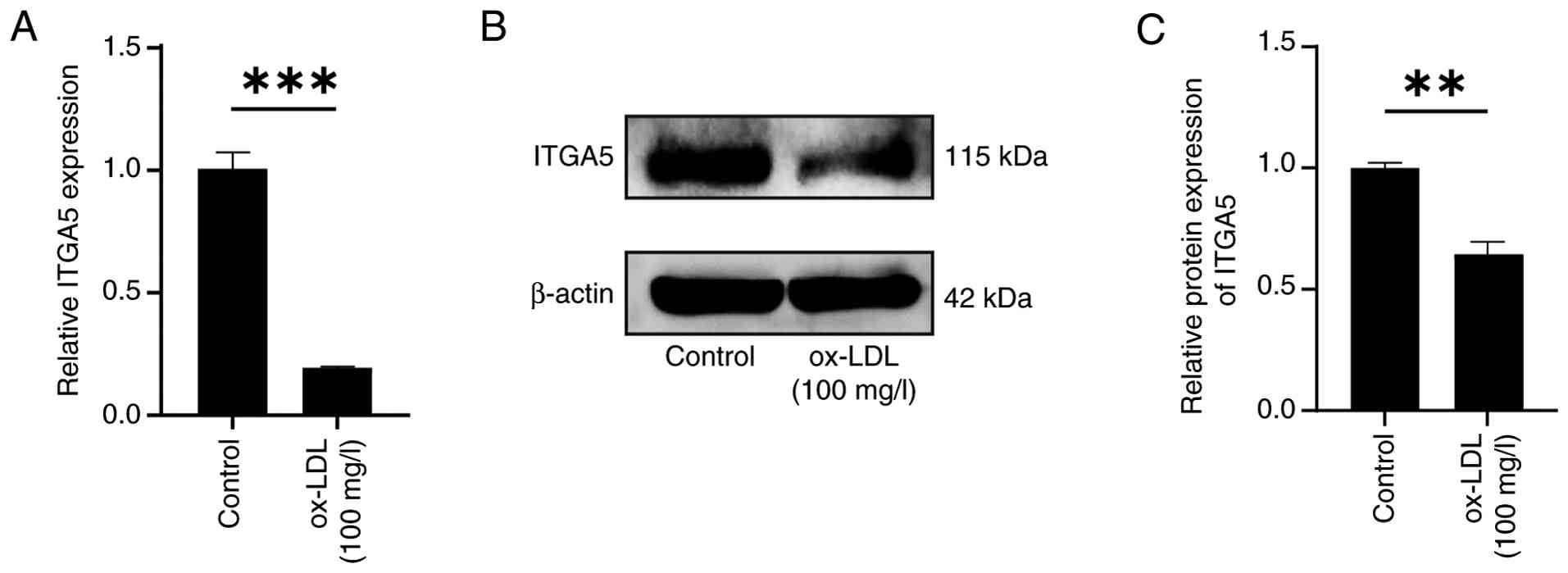 Cells were seeded into 6-well plates, and transfection was initiated once cell confluence reached 70–90%. miR2225p mimic (final concentration: 50 nM; cat. no. miR10004569-1-5), miR2225p inhibitor (final concentration: 100 nM; cat. no. miR20004569-1-5) and their respective negative controls (NCs; mimic NC; cat. no. miR1N0000001-1-5; final concentration: 100 nM; NC inhibitor; cat. no. miR2N0000001-1-5; final concentration: 100 nM) were obtained from Guangzhou RiboBio Co., Ltd. Similarly, the small interfering RNAs (siRNAs) targeting ITGA5 (siITGA5; final concentration: 100 nM) and its NC (siNC; final concentration: 100 nM), were acquired from Hanheng Biotechnology (Shanghai) Co., Ltd. For co-transfection of miR-222-5p inhibitor and si-ITGA5, cells were transfected with a mixture of miR-222-5p inhibitor (100 nM) and si-ITGA5 (100 nM) at the aforementioned final concentrations. The corresponding NC group was co-transfected with the NC inhibitor (100 nM) and si-NC (100 nM) to exclude non-specific effects of the nucleic acids. According to the manufacturer's instructions, the liquid transfection reagent (Lipofectamine® 3000; Thermo Fisher Scientific, Inc.) was briefly centrifuged (1,000 × g for 10 sec at 4°C) before use to collect any residual liquid reagent adhering to the tube walls, thus ensuring an accurate sample volume. Subsequently, RNA dilutions were prepared in sterile, RNase-free microcentrifuge tubes and combined with the transfection reagent, after which the resulting complexes were added dropwise to the cells. The transfected cells were then placed in a 37°C, 5% CO2 incubator and the medium was replaced with complete medium (DMEM supplemented with 10% FBS) after 6–8 h. Transfection efficiency was validated by reverse transcription-quantitative polymerase chain reaction (RT-qPCR) 24 h post-transfection. Functional experiments were performed 48 h post-transfection; this time window was selected to allow sufficient time for the mimic/inhibitor/siRNA to regulate target gene expression and induce detectable changes in cell functional phenotypes. The siRNA sequences were as follows: si-ITGA5, sense 5′CAGCUACCUAGGAUACUCU3′, antisense 5′AGAGUAUCCUAGGUAGCUG3′; and si-NC, sense 5′UUCUCCGAACGUGUCACGU3′, antisense 5′ACGUGACACGUUCGGAGAA3′. To eliminate potential interference from ox-LDL on the basal expression levels of miR-222-5p and the results of transfection efficiency assays, thus ensuring that the miR-222-5p mimic/miR-222-5p inhibitor alone was evaluated for its effects on the target miRNA, HUVECs used in the transfection efficiency validation experiments were not treated with ox-LDL.