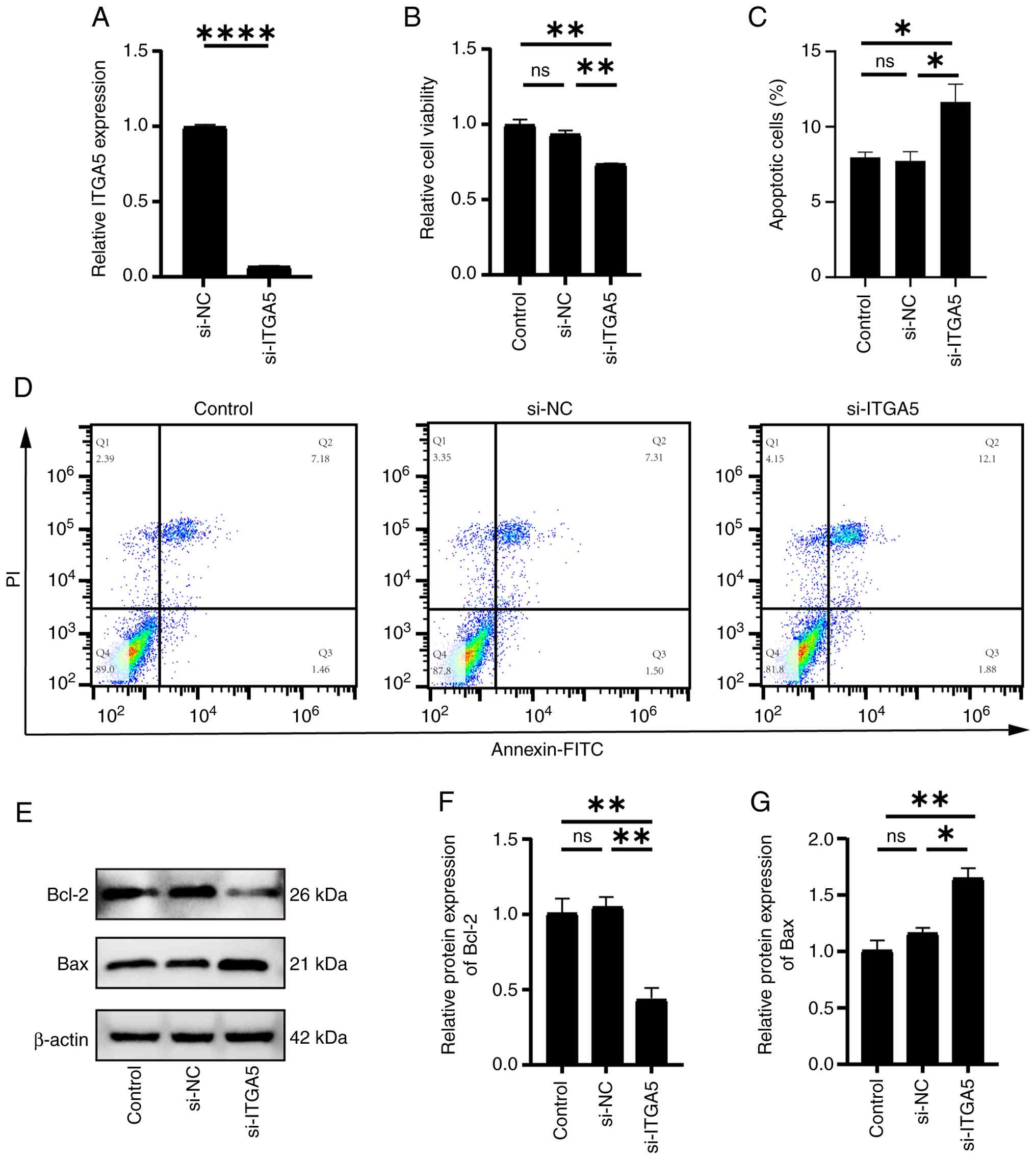 To further investigate the role of ITGA5 in endothelial cell apoptosis, cells were transfected with si-ITGA5 and knockdown efficiency was assessed by RT-qPCR. The analysis demonstrated a ~90% reduction in ITGA5 expression compared with that in the si-NC group (Fig. 7A). The CCK-8 assay revealed that ITGA5 knockdown significantly reduced cell viability (Fig. 7B), and the flow cytometric analysis revealed that a significant increase in the total apoptosis rate [sum of late apoptotic cells (Q2: Annexin V+/PI+) and early apoptotic cells (Q3: Annexin V+/PI−)], rising from 7.31+1.50% (Q2 + Q3) in the si-NC group to 12.10+1.88% (Q2 + Q3) in the si-ITGA5-transfected HUVECs (Fig. 7C and D). Fig. 7D displays a dot plot (Q1-Q4 distribution), while Fig. 7C presents the combined total apoptosis rate (Q2 + Q3). Western blot analysis revealed that si-ITGA5 transfection significantly upregulated Bax and significantly downregulated Bcl-2 expression (Fig. 7E-G). These findings suggested that ITGA5 exerted an anti-apoptotic effect in endothelial cells.