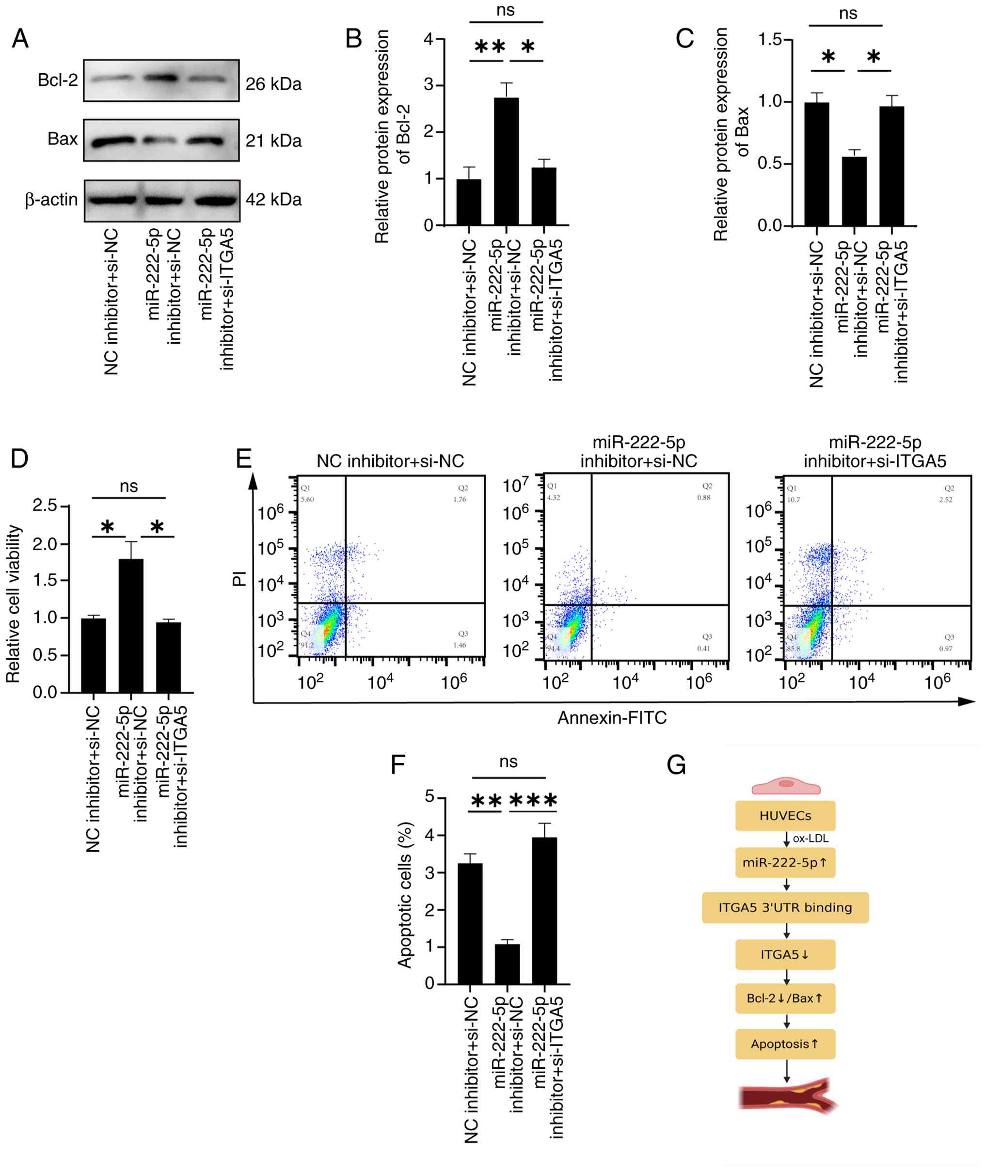 To further evaluate whether miR2225p regulated apoptosis via ITGA5 and contributed to AS, HUVECs were transfected with a miR2225p mimic and inhibitor and ITGA5 expression was examined. ITGA5 expression was significantly reduced following mimic transfection and increased following inhibitor transfection. In addition, co-transfection with the miR-222-5p inhibitor and si-ITGA5 reversed the protective effect of the inhibitor on apoptosis. Specifically, the level of apoptosis, initially reduced by the inhibitor, was restored when ITGA5 was downregulated. These findings provided functional evidence that miR-222-5p regulated apoptosis by directly modulating ITGA5 expression. In the present study, the reversal of the effect of the miR-222-5p inhibitor by transfection with si-ITGA5 not only supported the importance of ITGA5 in the anti-apoptotic signaling pathway of miR-222-5p but also identified ITGA5 as an important biomolecule in miR-222-5p-mediated cell survival signaling. This process reinforced the central role of the miR-222-5p/ITGA5 axis in regulating endothelial cell apoptosis. The molecular mechanism mediating this regulatory cascade is visualized in Fig. 8G, which outlines the sequential effects of the miR-222-5p-ITGA5 interaction on downstream signaling and apoptotic responses in the context of AS.