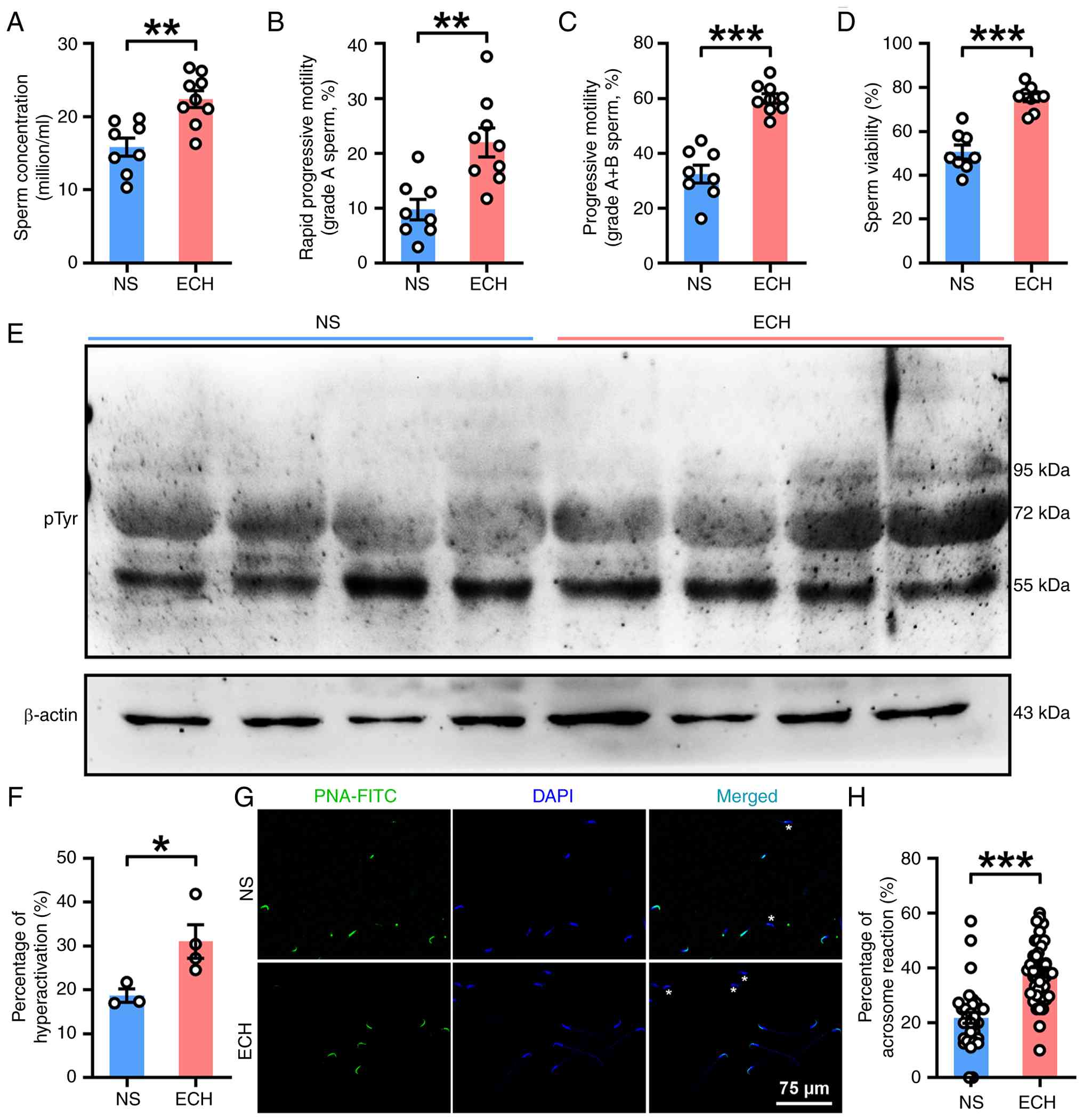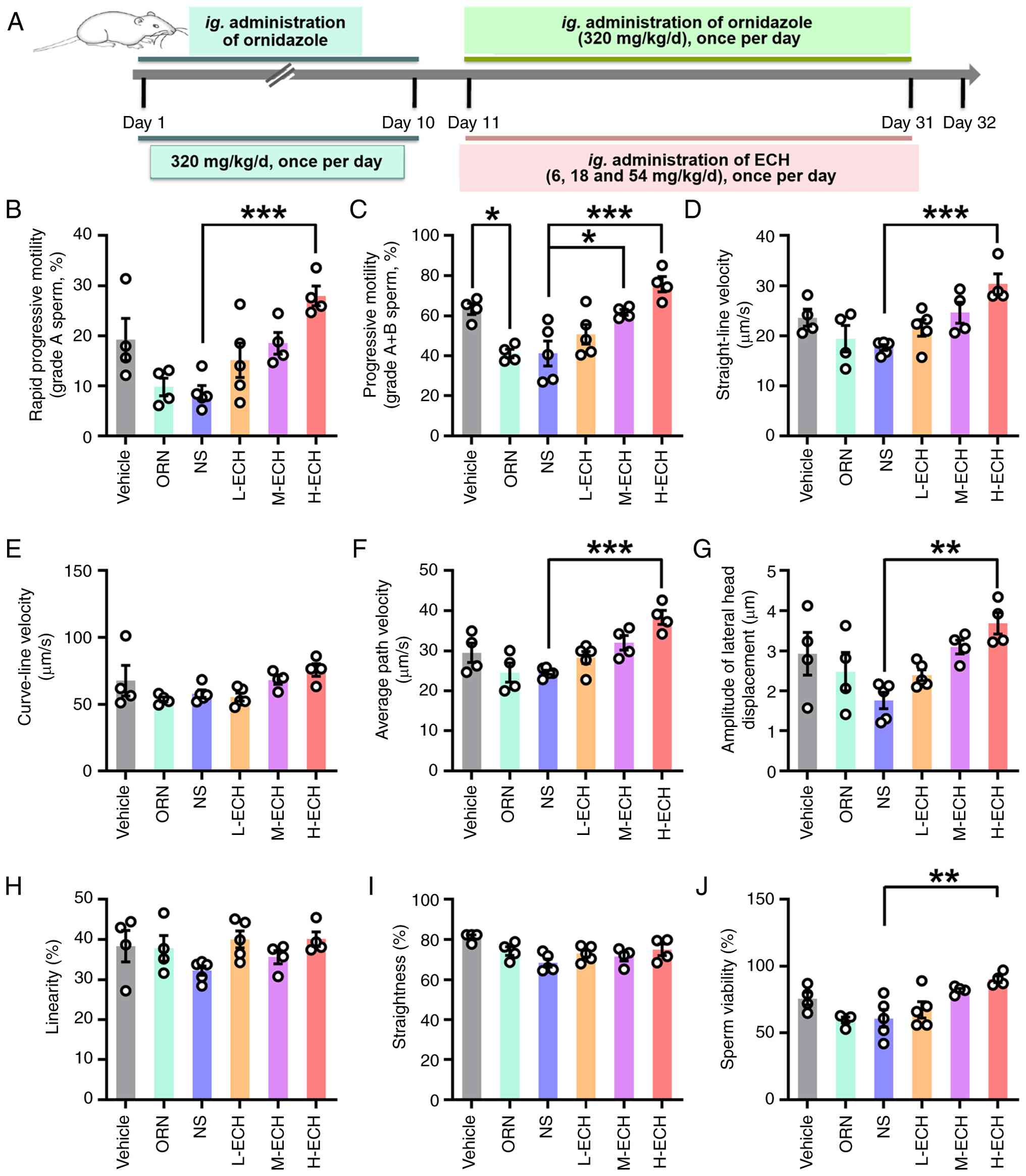 The semen parameters, including semen volume, sperm motility, sperm concentration and sperm morphology, were evaluated in human participants according to pre-established guidelines (42). To evaluate the direct effect of ECH on human sperm motility in vitro, 1 ml human semen was incubated with 0.06 mg/ml ECH at 37°C in a water bath and sperm motility parameters were analyzed using CASA at four time points: Immediately (0 min) and at 10-, 20- and 30-min post-incubation with ECH (42).