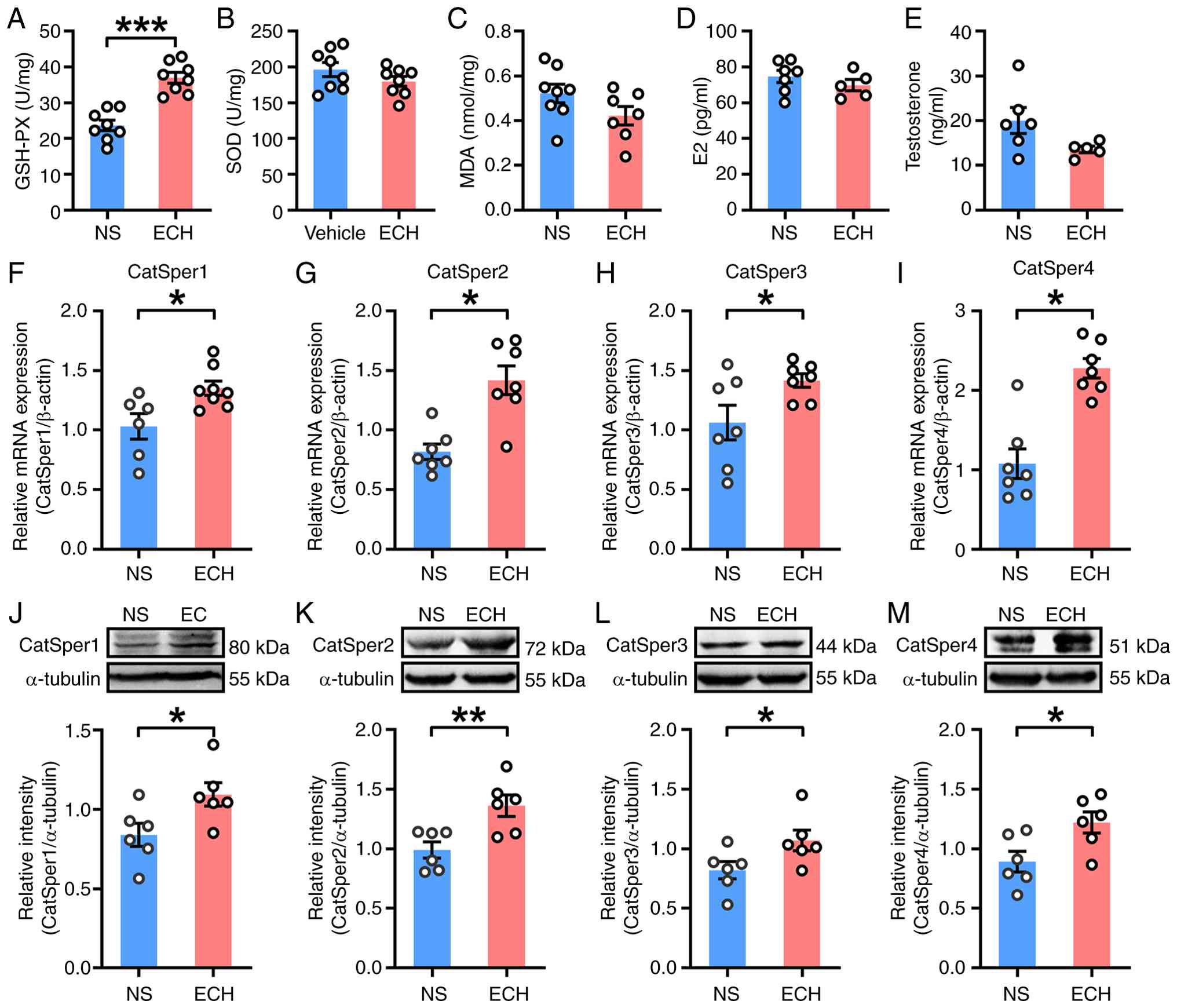 In conclusion, the data in the present study indicated that ECH improved sperm motility and fertilization capacity through multiple mechanisms, including enhanced antioxidant activity, as demonstrated by elevated GSH-PX levels, upregulated CatSper mRNA and protein expression and increased Sox5-mediated transactivation of the CatSper gene in AZS rats (Fig. S2). These findings provide novel insights into the role of plant-derived compounds in enhancing male reproductive health and have identified potential candidates for the development of new therapies for male infertility.