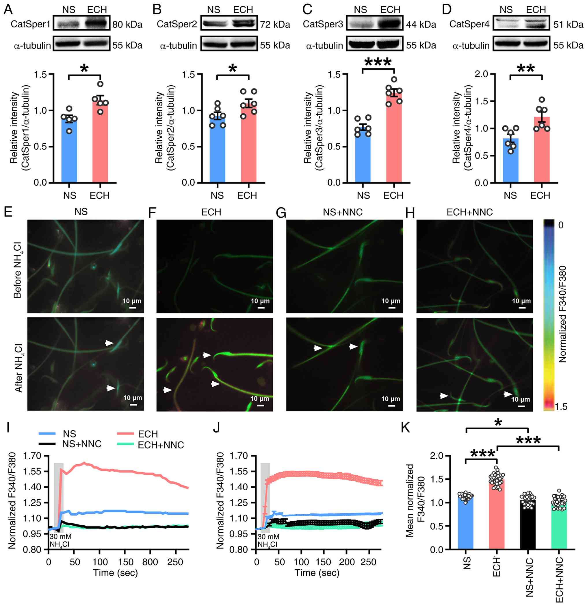 Due to the ECH-mediated enhancement of sperm motility, CatSper channel expression was examined. In testicular tissues, ECH significantly increased mRNA (Fig. 4F-I) and protein (Fig. 4J-M) levels of CatSper1-4, as compared with vehicle controls. Epididymal sperm also showed significantly increased CatSper1-4 protein expression (Fig. 5A-D). CatSper-mediated Ca2+ influx was subsequently evaluated (Figs. 5E-K). ECH treatment significantly enhanced NH4Cl-evoked intracellular calcium levels [Ca2+]i responses in the sperm of AZS rats at the single-cell (Fig. 5I), population (Fig. 5J) and mean intensity levels (Fig. 5K) compared with the NS group. Notably, the CatSper inhibitor NNC 55–0396 blocked NH4Cl-induced Ca2+ signals in both groups (Fig. 5I-K), supporting CatSper mediation. Collectively, these findings demonstrate that the functional upregulation of CatSper channels markedly mediated ECH-induced sperm motility improvement in AZS rats.