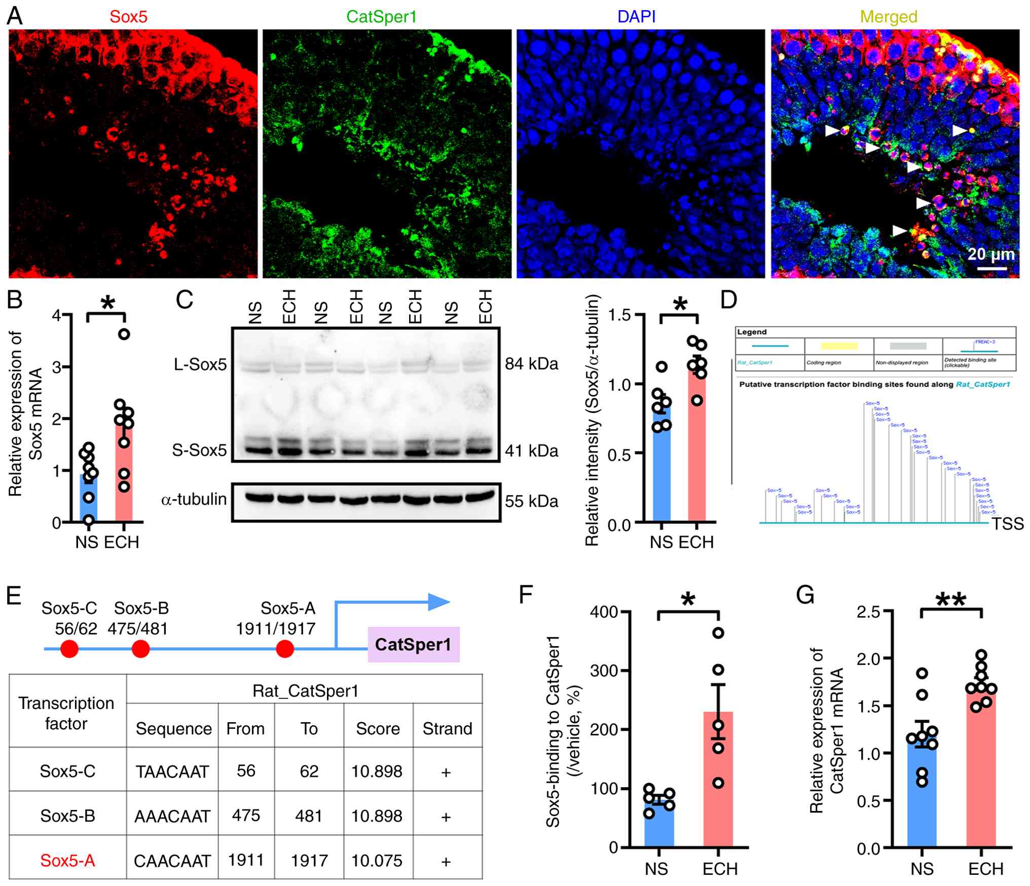 Subsequently, in silico analysis was employed to predict potential binding sites of Sox5 in the promoter region of the CatSper1 gene. The analysis revealed three distinct Sox5-binding sites in the CatSper1 gene promoter: i) Sox5-A, −1911 to −1917 bp upstream of the TSS; ii) Sox5-B, −475 to −481 bp upstream of the TSS; and iii) Sox5-C, located −56 to −62 bp upstream of the TSS (Fig. 6D and E). To validate these predictions, ChIP-qPCR was performed to assess the binding of Sox5 to the CatSper1 gene promoter at the Sox5-A site. A significant increase in the relative enrichment of Sox5 was observed at the Sox5-A site in the testicular tissues of the ECH-treated group compared with the vehicle-treated group (Fig. 6F). Furthermore, RT-qPCR analysis demonstrated a significant increase in CatSper1 mRNA expression in the ECH-treated group compared with the control group (Fig. 6G). These results suggest that ECH treatment enhances Sox5 expression, thereby promoting Sox5-mediated transcriptional activation of CatSper1 in the testicular tissues of AZS rats. Taken together, this cascade ultimately improved sperm motility and acrosome reaction capability in AZS rats.
