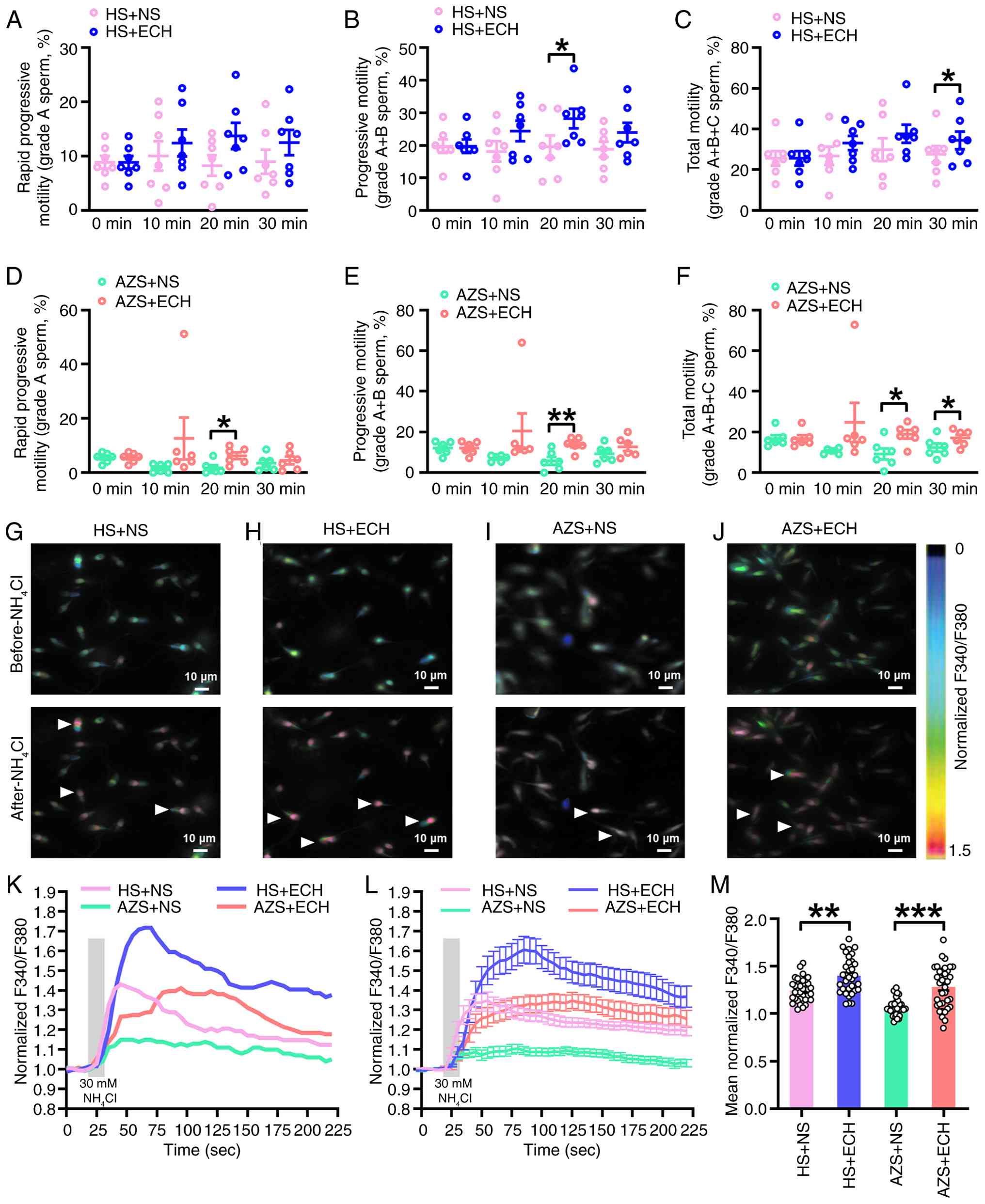 To validate the findings obtained from AZS rats, the present study investigated whether ECH treatment induced the functional upregulation of CatSper channels in human sperm. In vitro experiments were first performed to determine whether sperm motility was increased when ECH was directly added to human semen. Spermatozoa from healthy subjects (HS) or patients with iAZS were incubated with ECH prior to sperm motility analysis at 0-, 10-, 20- and 30-min post-incubation. The results demonstrated that ECH incubation significantly increased the progressive motility (grade A + B sperm) at 20 min and total motility (grade A + B + C sperm) at 30 min in sperm from HS (Fig. 7A-C). Notably, 20-min ECH incubation significantly improved sperm motility in samples from patients with iAZS, enhancing rapid progressive motility (grade A sperm), progressive motility and total motility (Fig. 7D-F). Subsequently, the effects of ECH incubation on CatSper-mediated Ca2+ influx in human sperm were examined. Notably, a marked increase in NH4Cl-evoked [Ca2+]i fluorescent signals was observed in sperm from both HS and patients with iAZS after 30-min incubation with ECH (Fig. 7G-J). In summary, a consistent enhancement of NH4Cl-evoked [Ca2+]i fluorescent signals was observed in the ECH-treated groups compared with their control counterparts in single spermatozoa (Fig. 7K) and in all tested sperm (Fig. 7L), as well as significant increases in the mean fluorescence intensity of all tested sperm post-NH4Cl exposure (Fig. 7M). These findings suggest that ECH incubation may have increased intracellular calcium levels [Ca2+]i in human sperm, thereby enhancing sperm motility.