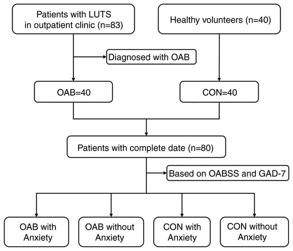The present study was conducted at Fujian Provincial Hospital and received approval from the Ethics Committee (approval no. K2024-10-019). Informed written consent was obtained from all participants. Inclusion criteria: All patients who meet the diagnostic criteria for OAB and healthy volunteers. Patients with any one of the following conditions were ineligible: urinary tract infection, various cystitis, urinary urogenital cancer, urinary tract stones, neurogenic bladder, pelvic organ prolapse, pregnancy and reluctance to participate in the present study. Between July 2023 and July 2024, a total of 83 patients presenting with LUTS and 40 healthy volunteers serving as controls were recruited from Fujian Provincial Hospital. Of the 83 patients, 43 were excluded due to LUTS resulting from other causes, leaving 40 patients who were diagnosed with OAB and included in the disease cohort. Comprehensive clinical data were successfully collected for 80 participants, encompassing the overactive bladder symptom scores (OABSS; Table SI) and the generalized anxiety disorder scale-7 (GAD-7; Table SII). Based on the OABSS scale, a diagnosis of OAB is made when urinary urgency has a score of ≥2 and the overall OABSS score is ≥3. When OABSS with a total score range of 3–5, mild OAB; 6–11, moderate OAB; ≥12, severe OAB. When GAD-7 with a total score range of 0–4, normal; 5–9, mild anxiety; 10–13, moderate anxiety; 14–18, moderately severe anxiety; 19–21 points, severe anxiety. These assessment tools are primarily utilized for the screening and evaluation of OAB severity and anxiety levels, respectively (21). Based on the OABSS and GAD-7 results, participants were categorized into four groups: OAB with anxiety (n=33), OAB without anxiety (n=7), control with anxiety (n=5), and control without anxiety (n=35). The recruitment process for the study participants is illustrated in Fig. 1.