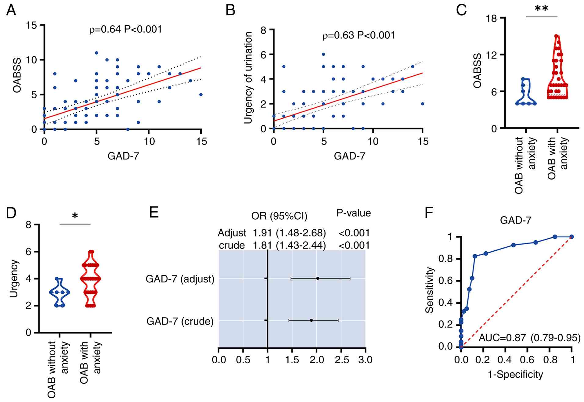 To elucidate the relationship between anxiety and OAB, and to determine whether anxiety can induce OAB, the present study conducted correlation and regression analyses. The findings indicated a positive correlation between OABSS and the GAD-7 (Fig. 2A). Additionally, urinary urgency, a key symptom of OAB, was positively correlated with GAD-7 (Fig. 2B). Subsequently, all OAB patients were categorized into two groups based on the presence or absence of anxiety and compared their OABSS and urinary urgency scores. The results demonstrated that OAB patients with anxiety exhibited markedly higher OABSS and urinary urgency levels compared with those without anxiety (Fig. 2C and D). To further explore the causal relationship between anxiety and OAB, the present study initially performed a univariate logistic regression analysis on GAD-7, which yielded an odds ratio (OR) of 1.81 (95% CI: 1.43–2.44), with a crude P-value of <0.001. This was followed by a multivariate logistic regression analysis, incorporating all baseline variables, which resulted in an adjusted OR of 1.91 (95% CI: 1.48–2.68), with an adjusted P-value of <0.001 (Fig. 2E). In conclusion, receiver operating characteristic (ROC) curves were used to evaluate the potential of anxiety as an independent risk factor for predicting the occurrence of OAB. The GAD-7 demonstrated a notably high predictive accuracy, with an area under the curve (AUC) of 0.87 (95% CI: 0.79–0.95) (Fig. 2F), the specificity was 0.875, the sensitivity was 0.825 and the Youden's index was 1.7. This aspect of the present study effectively demonstrated, at a clinical level, that anxiety can be employed as an independent risk factor for forecasting the onset of OAB.