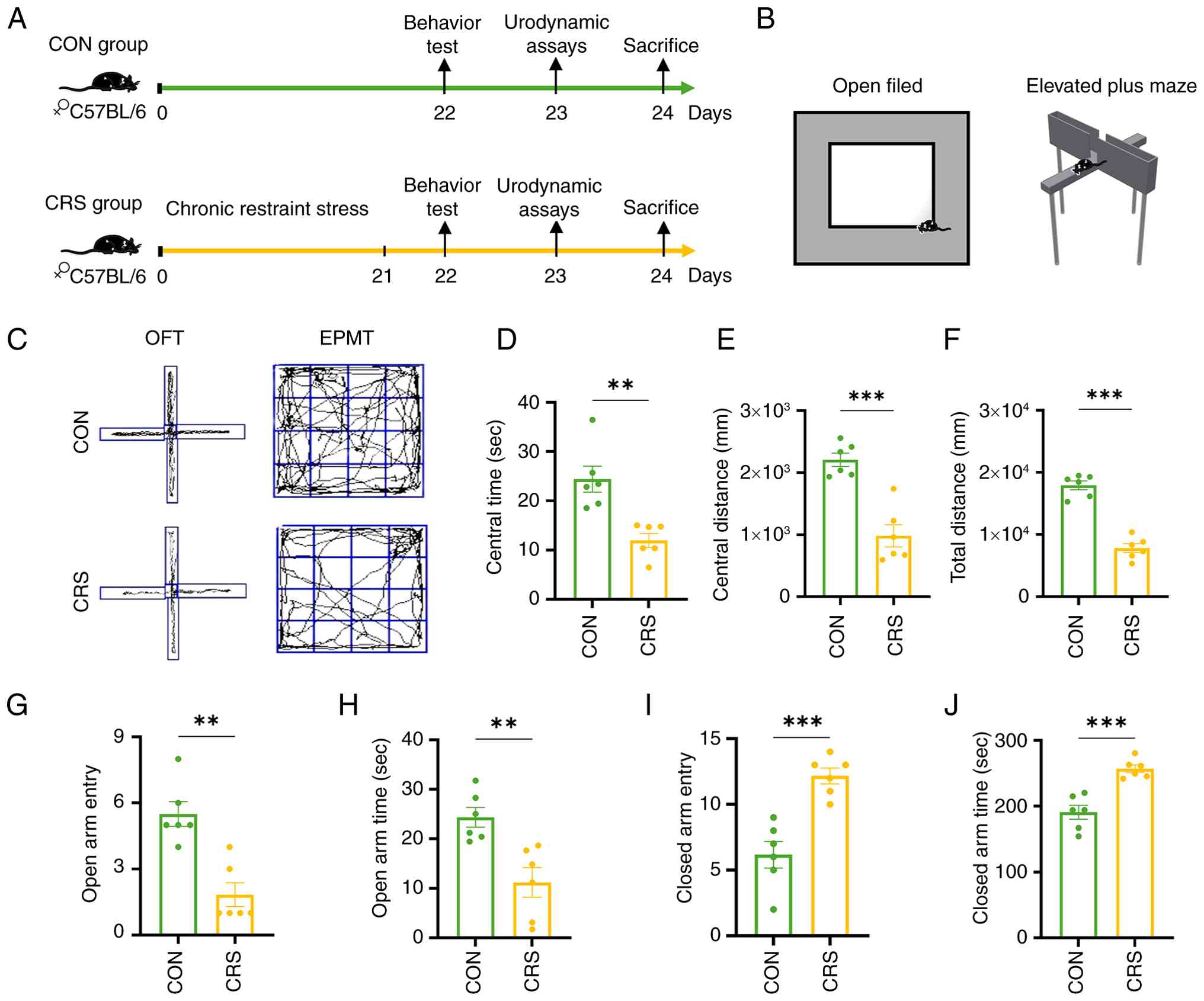 In the open-field (OF) test (Fig. 3B and C), the time spent (11.98±1.41 sec) by the CRS mice in the central area, the distance traveled (983±179 mm) during activity, and the total distance traveled (7,803±727.10 mm) were all markedly lower than those of the control group (24.41±2.63 sec), (2,209±106.80 mm), (1,7926±722.10 mm), (Fig. 3D-F). In the elevated-plus maze (EPM), The number of times the CRS mice entered the open arm (1.83±0.54)and the duration they stayed (11.20±2.97 sec) there were markedly lower than those of the control group (5.50±0.56), (24.35±2.00 sec) while the number of times they entered the closed arm (12.17±0.60) and the duration they stayed (257.10± 5.83 sec) there were markedly higher than those of the control group (6.16±1.01), (190.90±10.60 sec), (Fig. 3G-J). These changes confirmed that CRS induced anxiety-like behavior, as the mice exhibited behaviors resembling anxiety, such as reduced exploration desire and avoidance of conflicts.